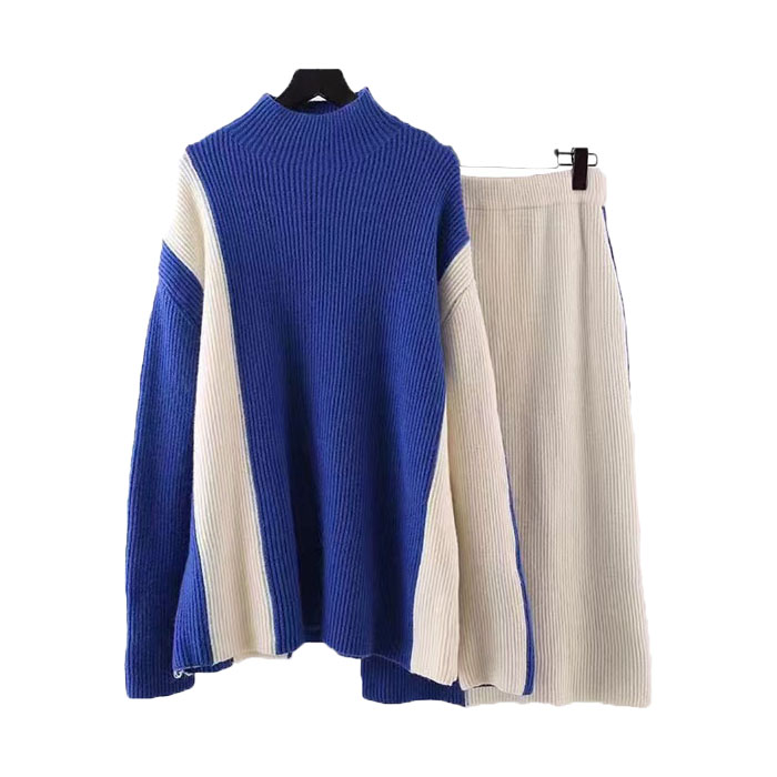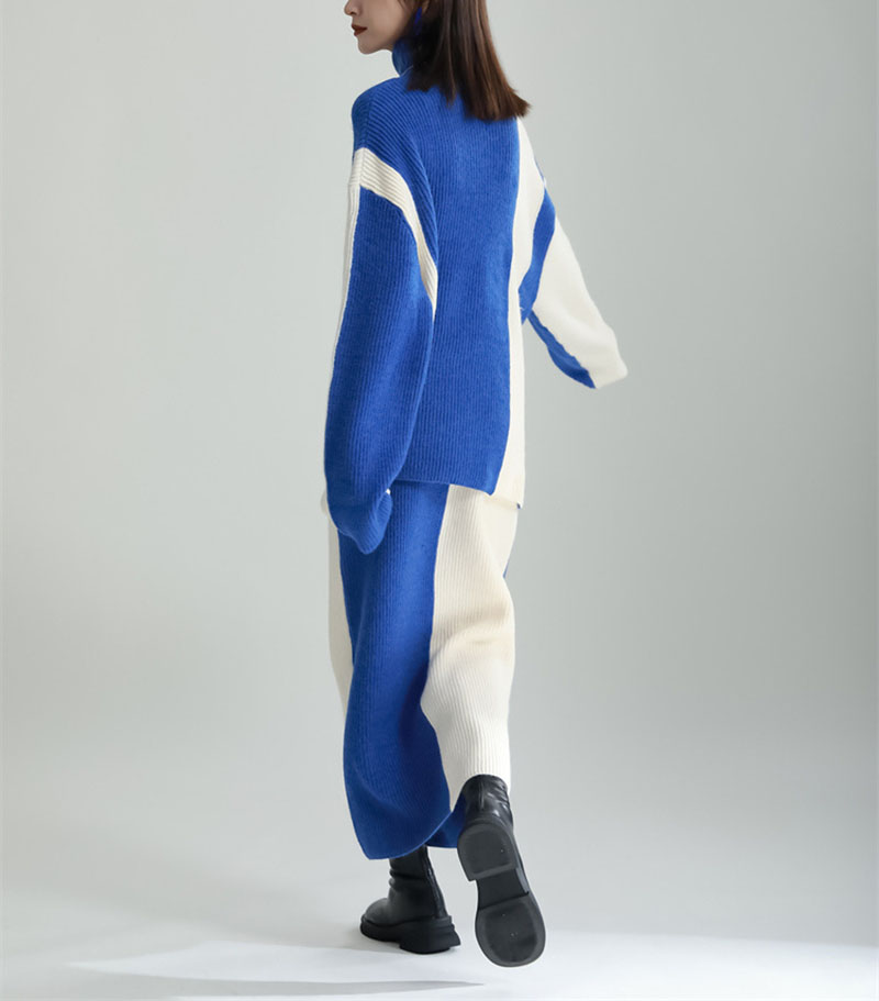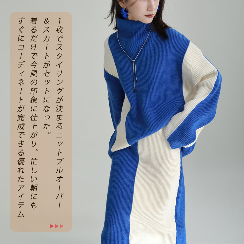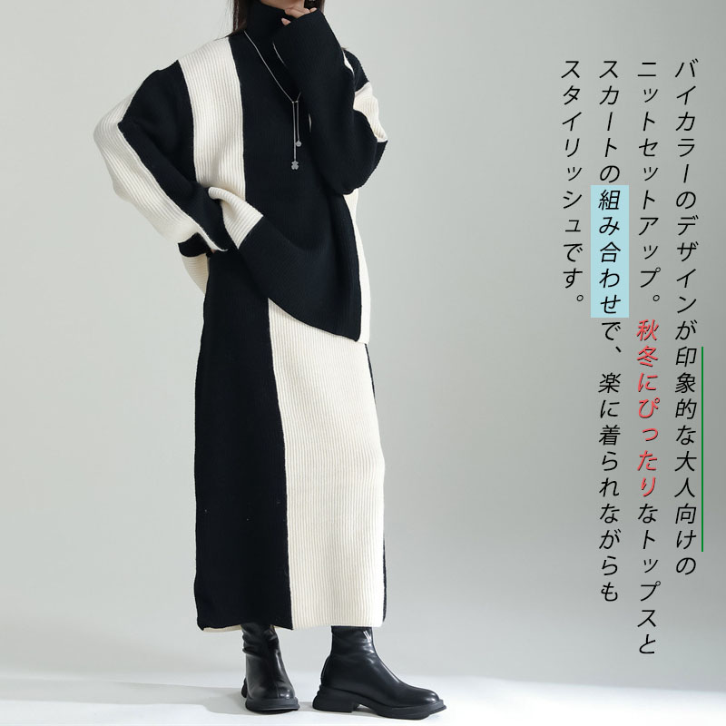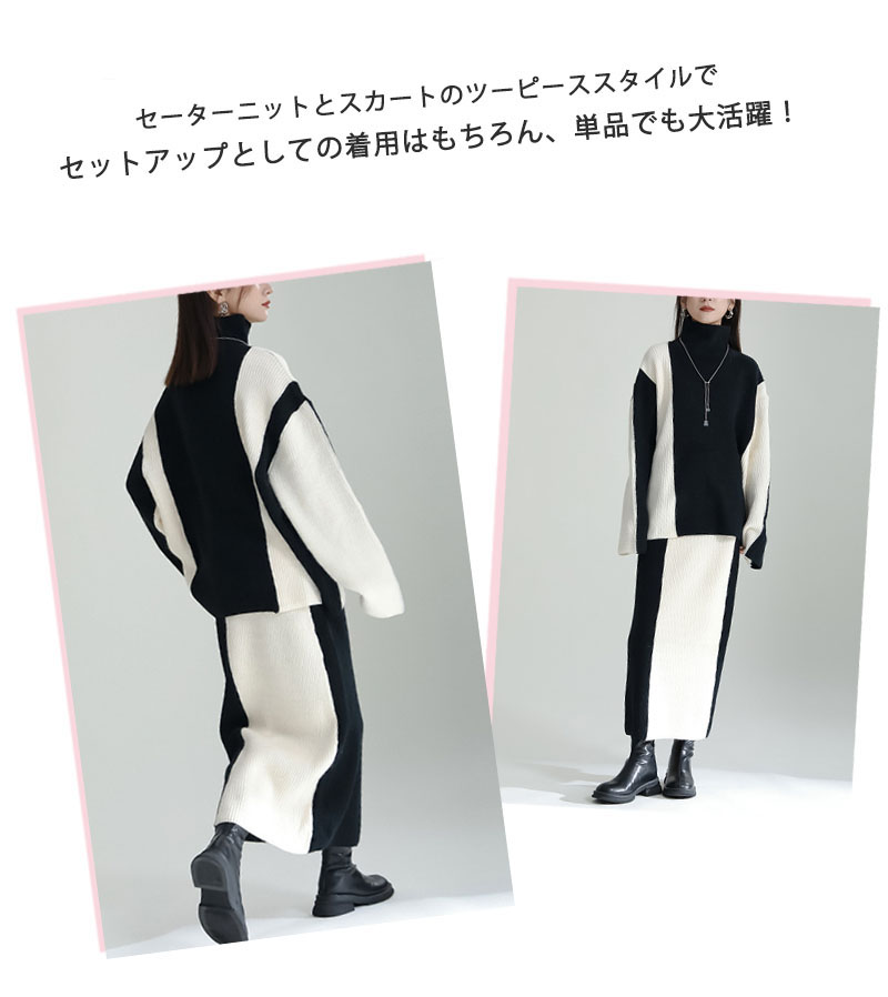 ニットセットアップ レディース スカートセット 秋冬 厚手 ハイネック ニットアップ 配色セーター タイトスカート 上下セット 2点セット リブニット ロングスカート ゆったり 着回し ボトルネック