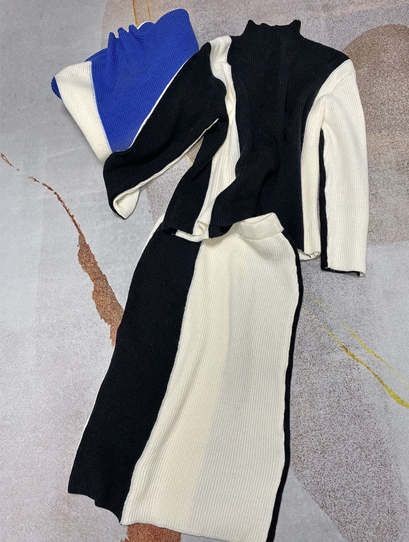 秋冬のスタイルにぴったりなニットセットアップは、配色セーターとタイトスカートの2点セットです。
