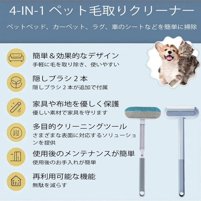 ペットブラシ 猫ブラシ 犬ブラシ 猫グッズ 抜け毛 ワイパー 毛玉取り 猫用 抜け毛取り 抜け毛取りクリーナー 4in1 犬用 抜け毛取り用品 ペット毛対応 毛玉除去ブラシ ペット用 繰り 猫毛髪掃除