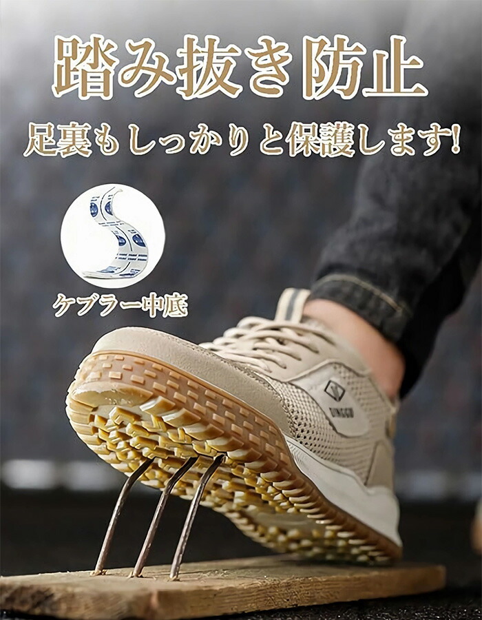 【つま先保護&踏み抜き防止】鋼鉄製のつま先保護とケブラー繊維の踏み抜き防止を両立。工事現場や工場での作業に適した、実用的な安全設計です。・鋼鉄先芯 - 落下物からつま先を保護・ケブラー中底 - 釘などの鋭利な物を踏んでも安心