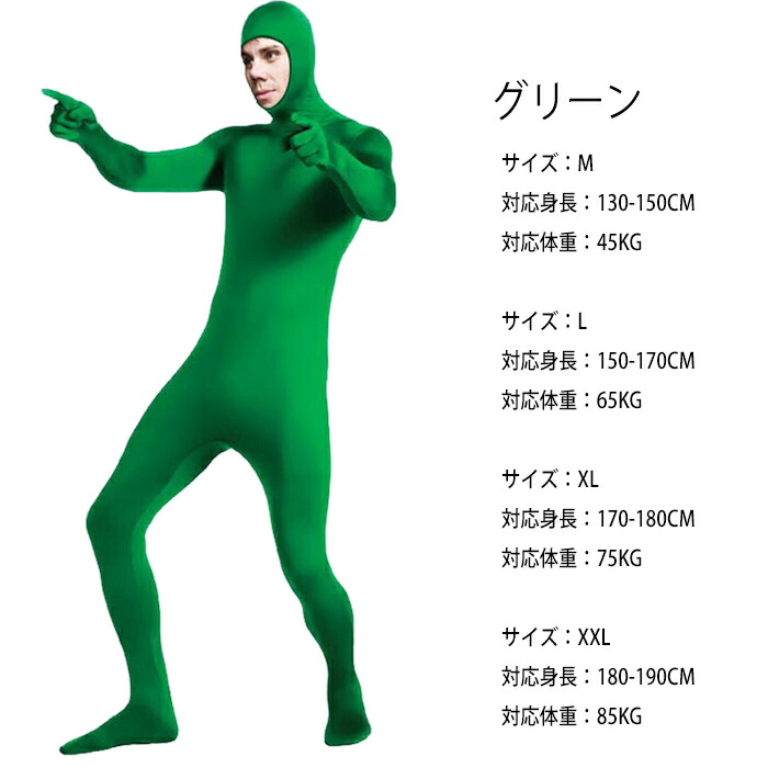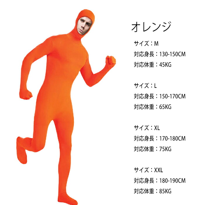 商品名:全身タイツ コスプレ 豊富な10色 レディース メンズ キッズ 子供 男女兼用 ハロウィン 衣装 仮装 顔出し 肌色 黒 緑 青 オレンジ ブロク インナー ストレッチ 余興 宴会 新年会 演しもの イベント パーティー 文化祭 忘年会 子供用