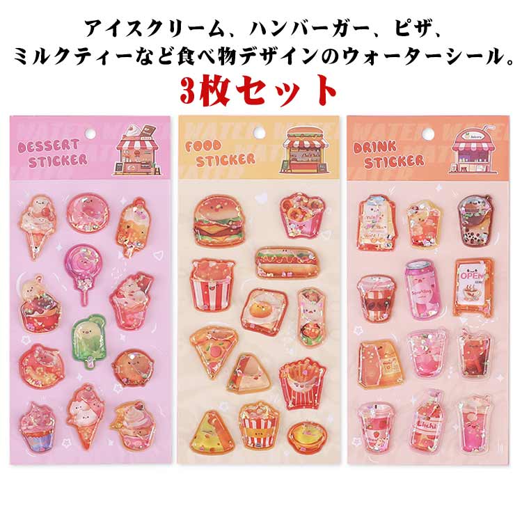 アイスクリーム、ハンバーガー、ピザ、ミルクティーなど食べ物デザインのウォーターシール。【3枚セット】