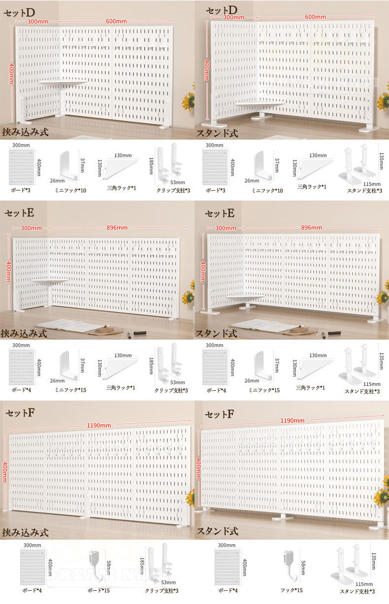 パンチングボード 有孔ボード 幅90 スタンド式 挟み込む式 セットA セットB セットC セットD セットE セットF