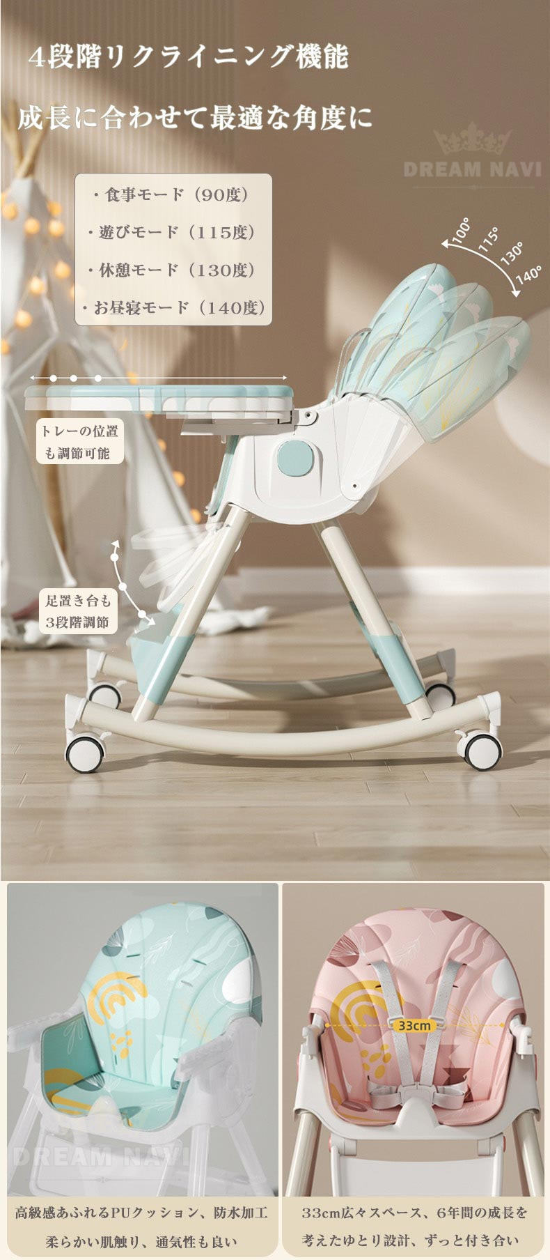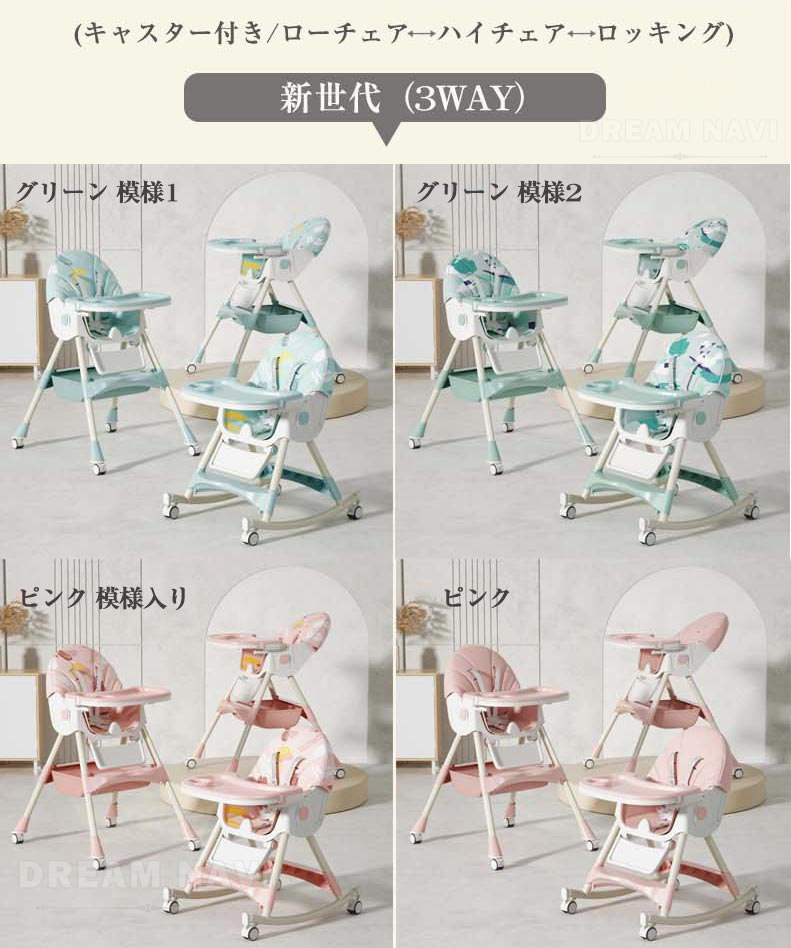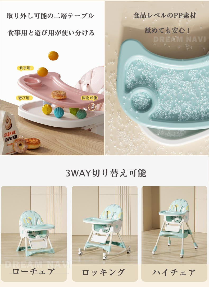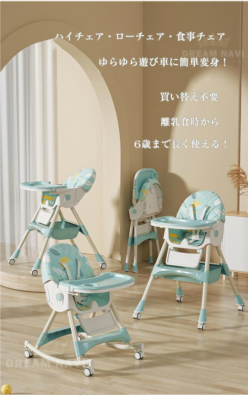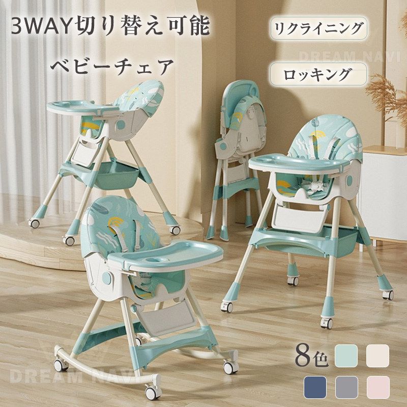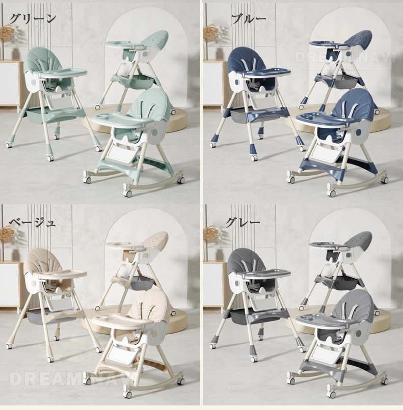 多機能 折りたたみ ベビーチェア ハイチェア ローチェア ハイローチェア 3WAY 切り替え テーブルチェア リクライニング ロッキング キャスター 椅子 安定構造 立ち上がり防止 離乳食 滑り止め