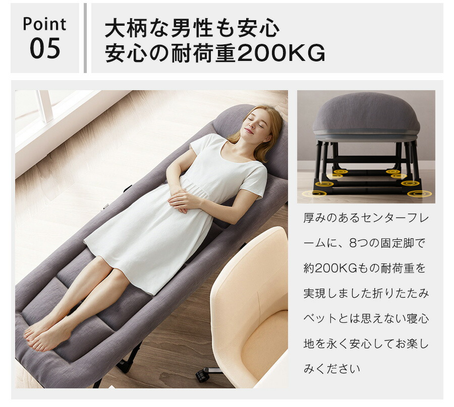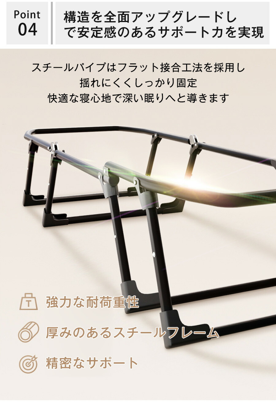 軽量 4-5kg、耐荷重 300kg、収納コンパクト。幅 170 - 200cm、幅 55 - 66cm。介護、キャンプ、車載、オフィス昼寝に最適。布団、腰痛対策、高品質です。