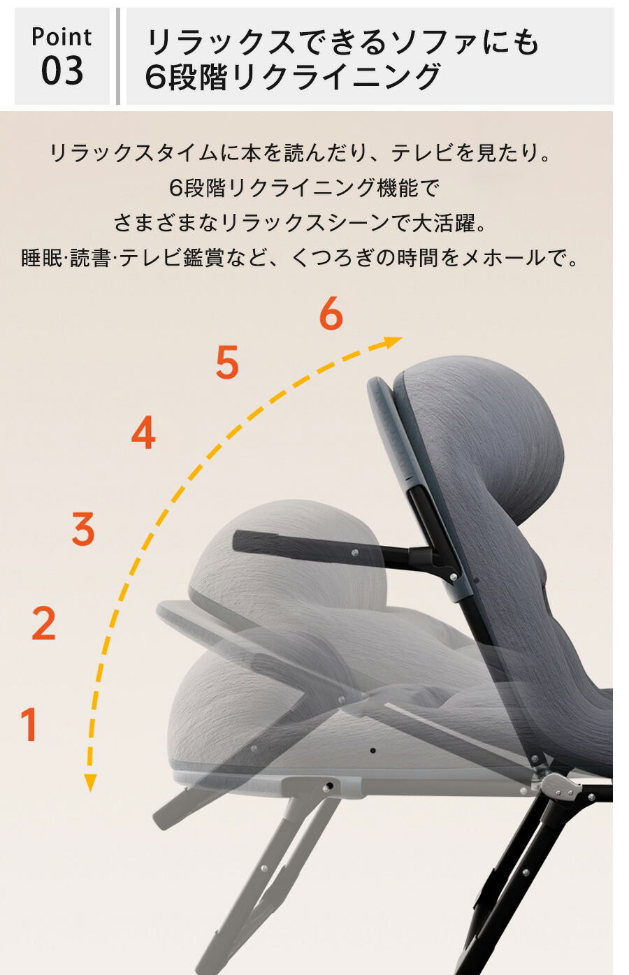 背もたれの角度を6段階で調節可能。読書やテレビ鑑賞、リラックスなど、シーンに合わせて最適な角度に調整できます。