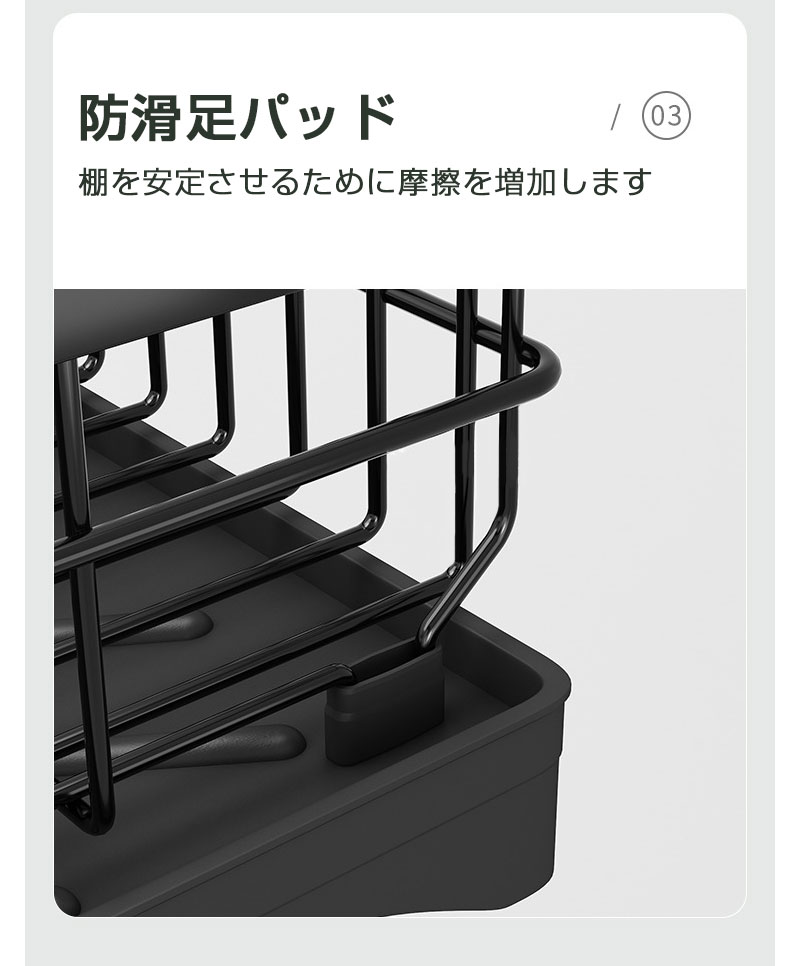 錆びにくい耐久性:防錆コーティングを施した高級カーボンスチール製のこの排水ラックは、優れた耐荷重性と耐久性を備え、腐食にも耐えながら、長期間美しい外観を保ちます。滑り止め脚が安定性を高め、カウンタートップを保護します。