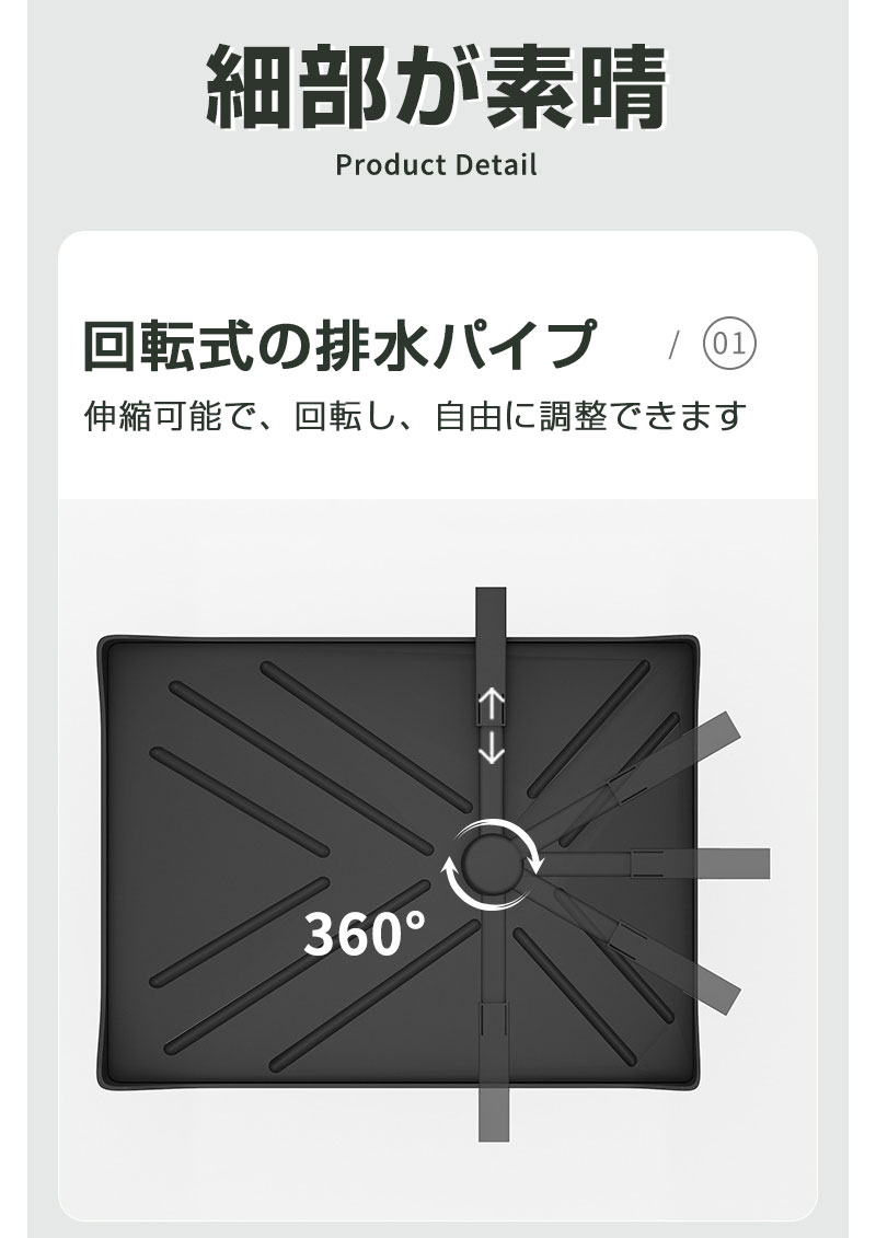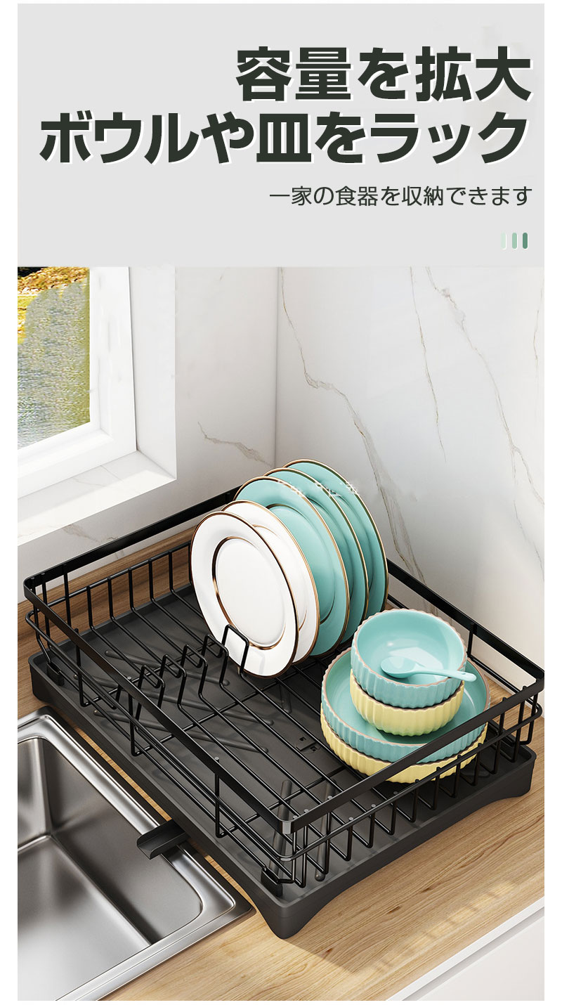 たっぷり収納:このディッシュラックは、鍋、フライパン、まな板、特大皿などの大型キッチンアイテムを収納できるよう専門的に設計されています。キッチンをすっきりと整頓し、必需品を効率的に乾かすことができます。考え抜かれたデザインがスペースを最大限に活用し、どんなキッチンにもぴったりです。この実用的なソリューションで、すっきりとしたカウンタートップをお楽しみください。