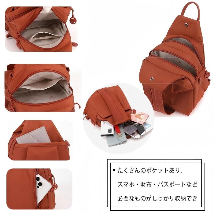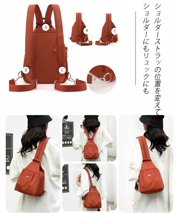 「小さめなのに大容量!」旅行や通勤もこれ一つでOK。撥水・軽量で、どんなシーンも快適に!たくさんのポケットで整理整頓がしやすく、スマホ・財布・パスポートなど必要なものがしっかり収納できます。
