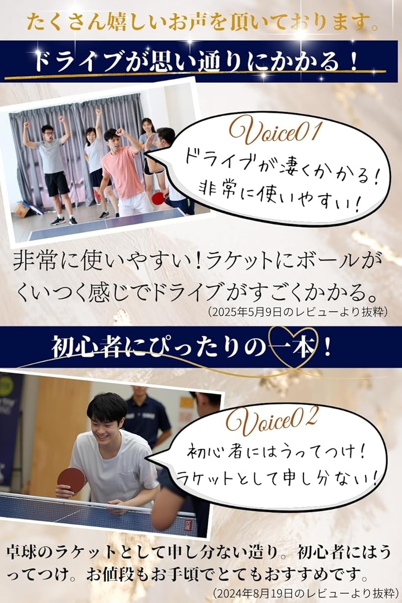 そのカーブが手にフィットし卓球をやり始める初心者にも馴染みやすく上級者まで幅広く使用されております。