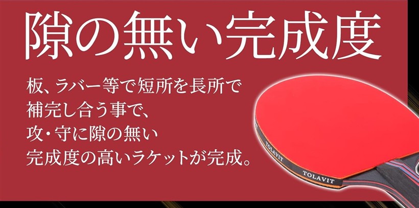 「隙の無い完成度」板、ラバー等で短所を長所で補完し合う、攻・守に隙の無い完成度の高いラケットです。