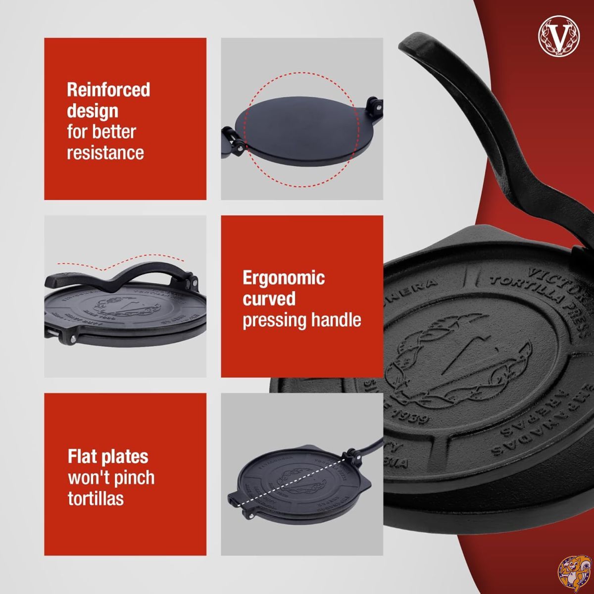 ✅【カラー】ブラック 【サイズ】 20 × 24 × 7 cm【重量】 3.0kg【素材】鋳鉄HDアイアン 【選べるサイズ展開】VICTORIAのトルティーヤプレスは天然素材で作られており、メンテナンスが簡単です。複数のサイズ(6.5インチ・8インチ・10インチ)をご用意していますので、シーンに合ったサイズをお選びください。各プレスにはレバー用の予備のねじが付いています。