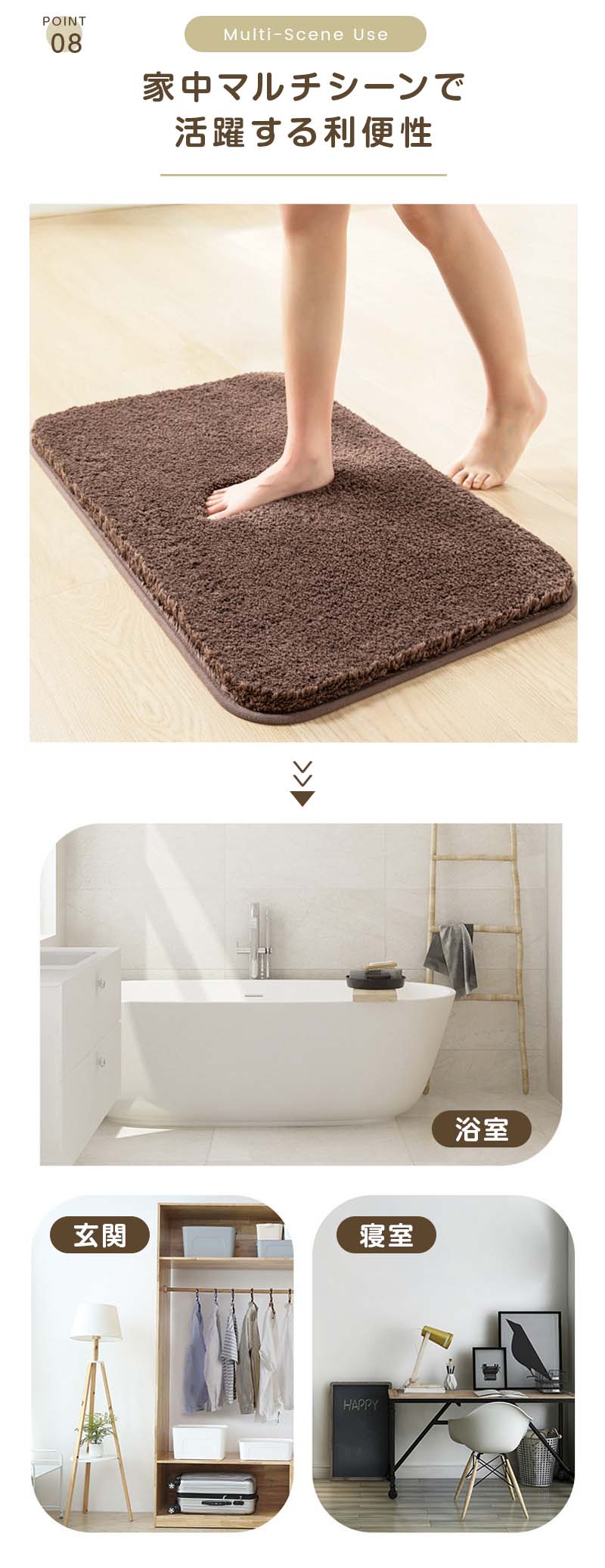 浴室前はもちろん、玄関マット、ベッドサイド、デスク足元など、