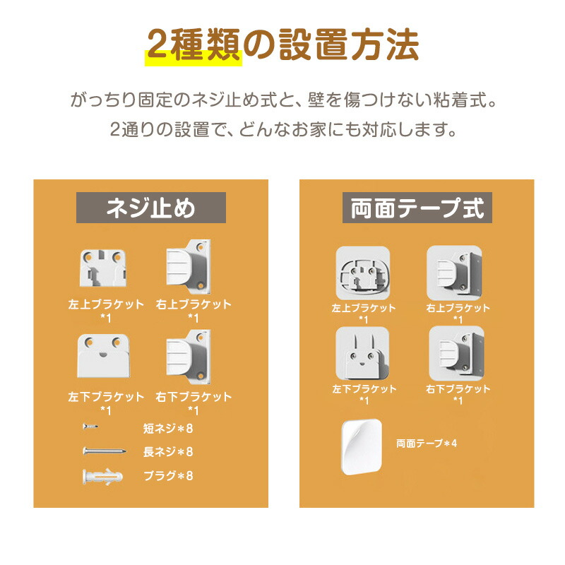 ・両面テープ式:壁を傷つけず設置したい賃貸住宅にも対応