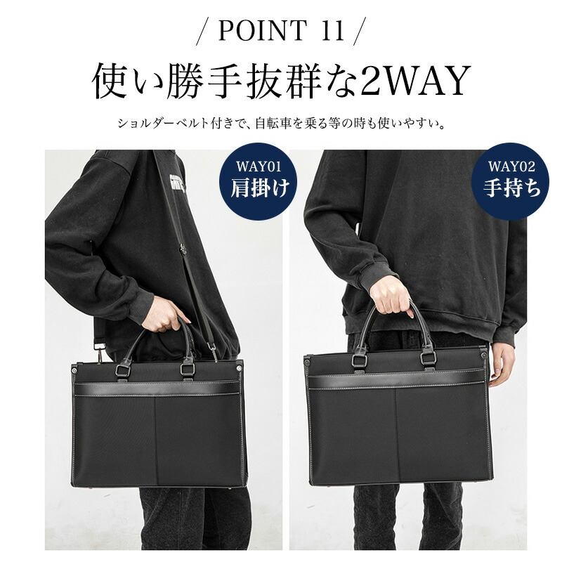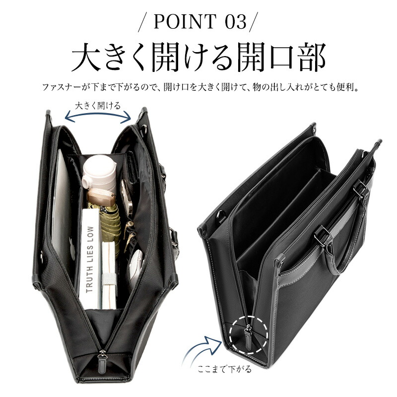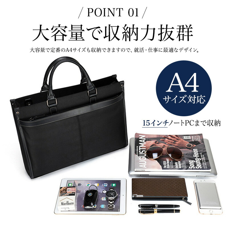 定番のA4サイズの書類やノートPCも楽々収納できる大容量設計で、就活やビジネスシーンで大活躍!必要な書類をすっきり整理でき、外出時も安心して持ち運べます。