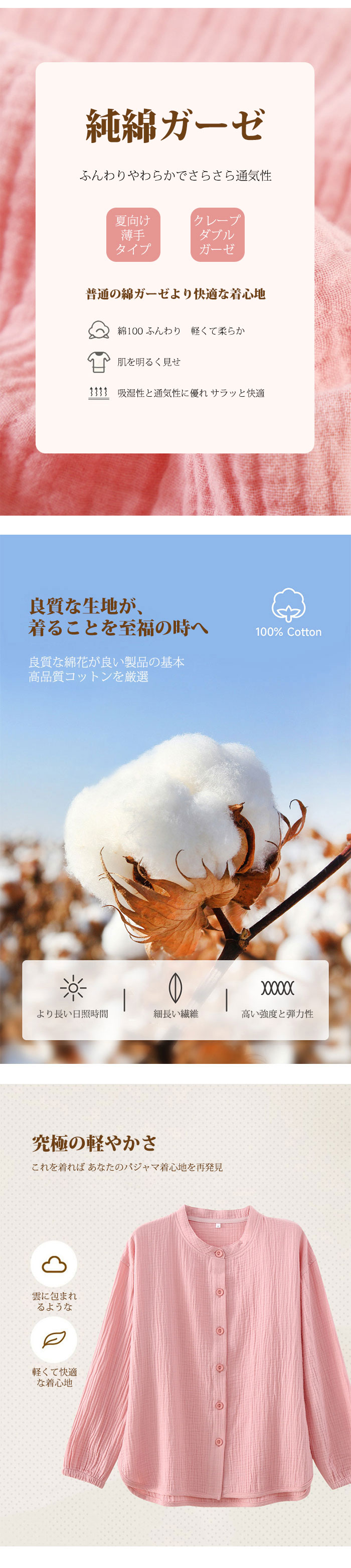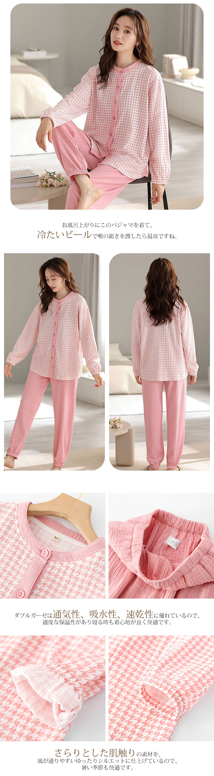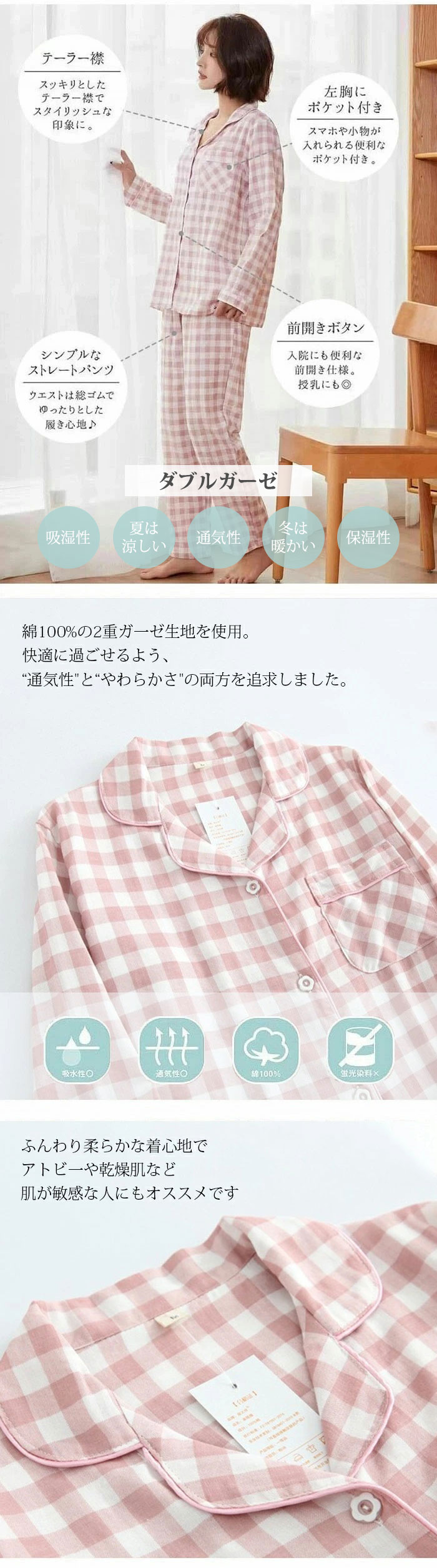 ガーゼ パジャマ レディース 長袖 ダブル ルームウェア 綿100% 前開き 春 セットアップ 二重ガーゼ 部屋着 襟付き 上下セット 寝間着 即乾 コットン ゆ 柔らかい