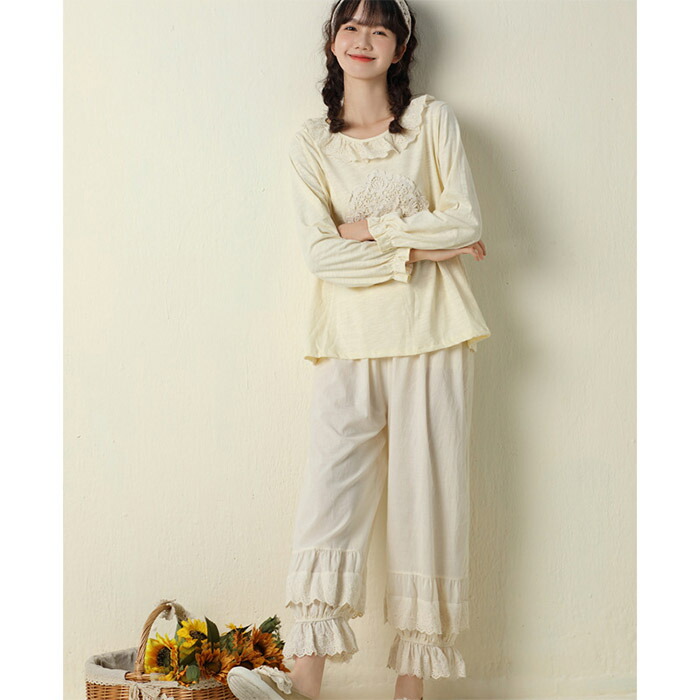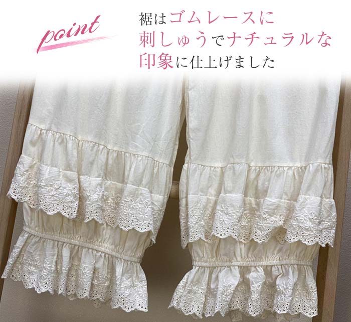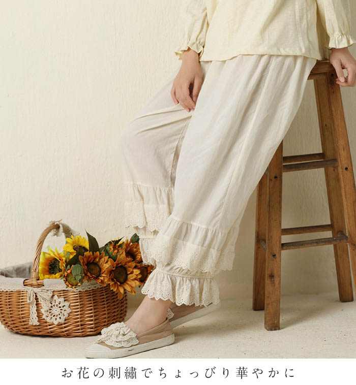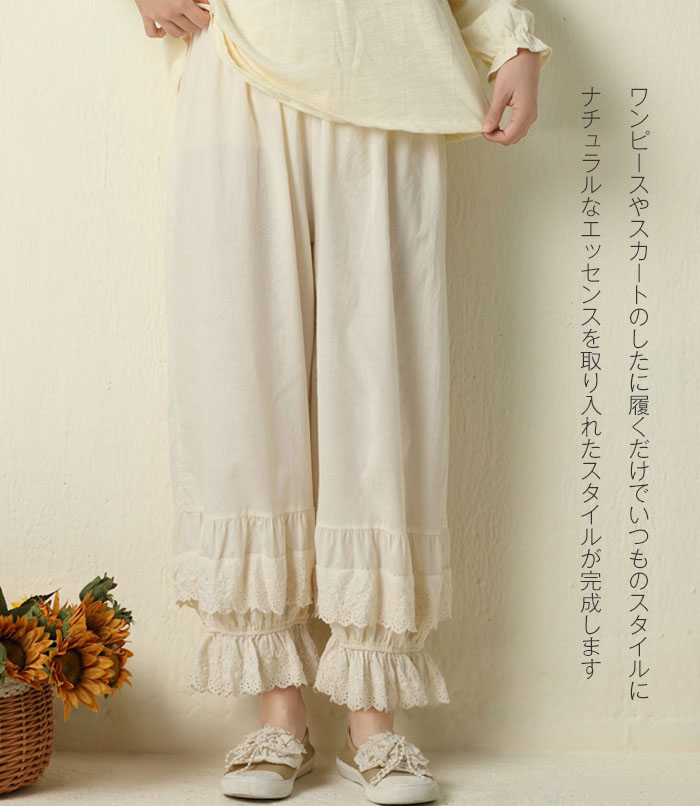 ペチパンツ レース 刺繍 ロング パンツ インナー 透け 防止 レディース ナチュラル 裾ゴム ゆったり 大きめ 楽 涼しい 春 夏 秋 かわいい おしゃれ シンプル カジュアル 重ね着 大人可愛い