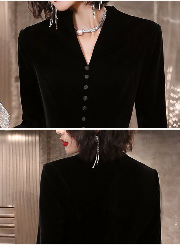 ▸ こちらのドレスは、結婚式、演奏会、披露宴などのフォーマルなイベントにぴったりです。ブラックのベルベット素材とVネックデザインが上品でありながらも華やかさを引き立て、特別なシーンに最適です。by Everyshop