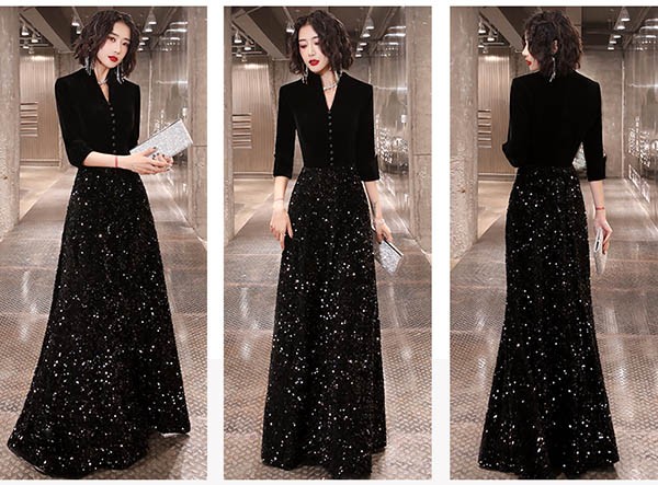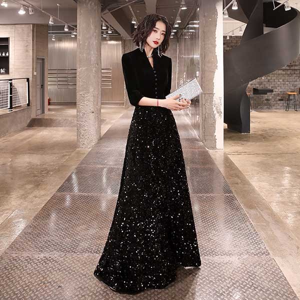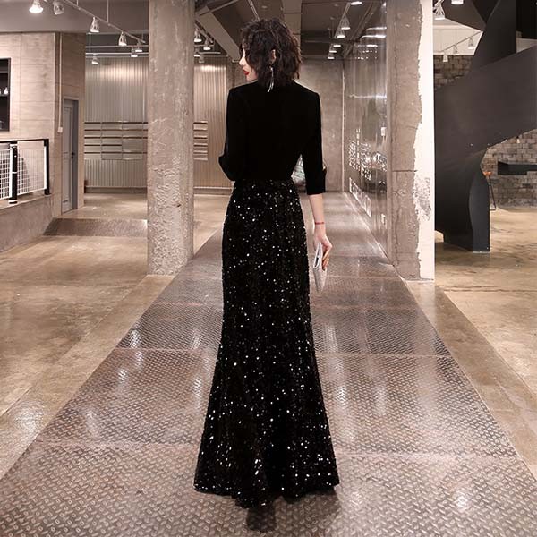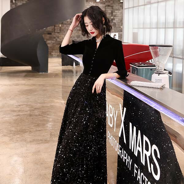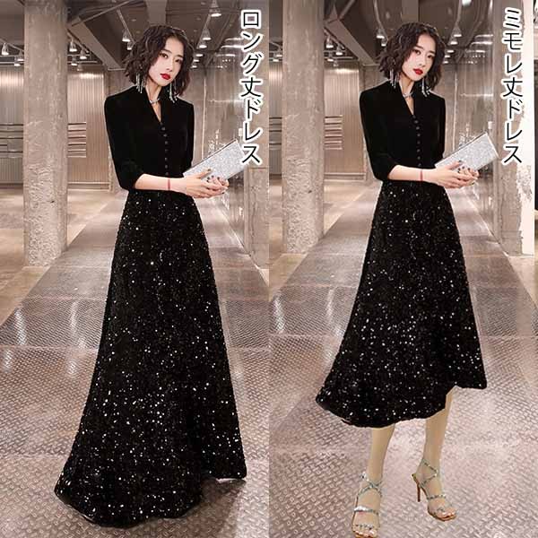 ドレス 大人 ピアノ 発表会 ロングドレス イブニングドレス 黒 演奏会 結婚式 母親 ミセス向けドレス ピアノ発表会 袖付き 小さいサイズ 大きいサイズ ベルベット ロング ワンピース ブ ミモレ丈