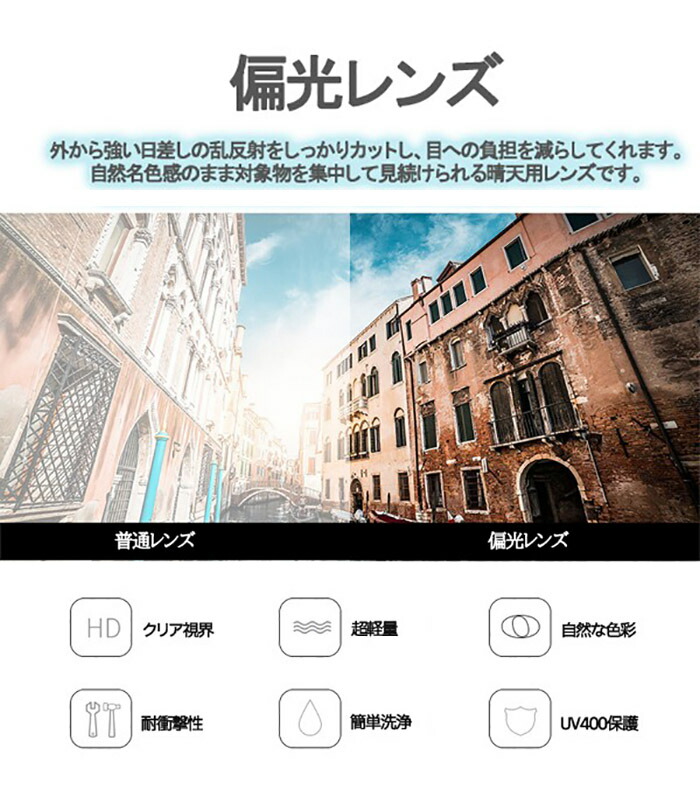 ▸ 偏光レンズは、水面や路面、ガラスの反射光などの**ギラつき**を効果的にカットし、視界の眩しさを軽減いたします。これにより、クリアで快適な視界を確保できます。by Happysunny