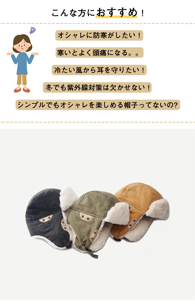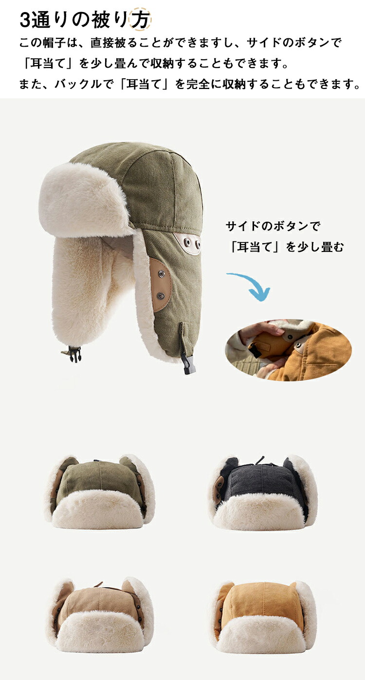 【超便利なデザイン】下部にバックルがあり、風で帽子が吹き飛ばされることを防ぐことができます。サイドにはボタンがついており、「耳当て」を畳んで収納することができます。冬の間、非常に実用的な帽子です。