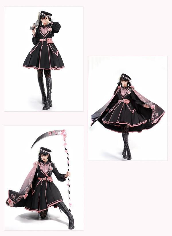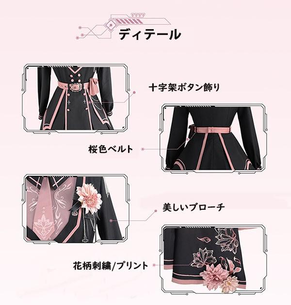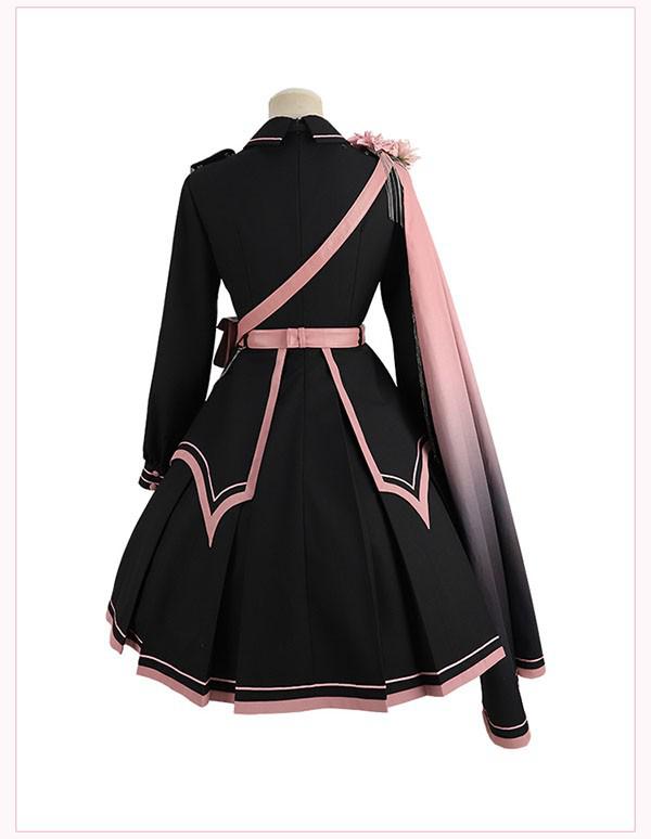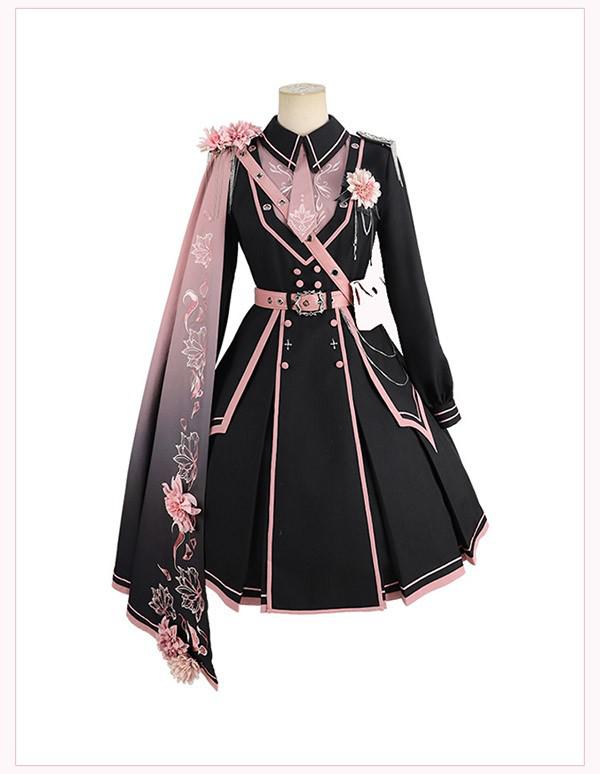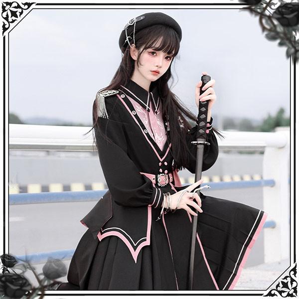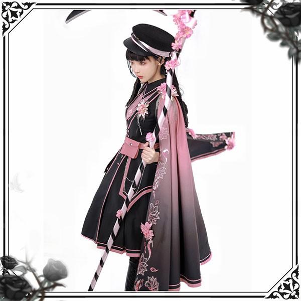 和風ロリータ ミリタリー風ワンピース S~XL 学園祭 イベント レディース 黒×ピンク 刺繍 帯風ベルト かわいい 個性的 コスプレ 衣装 撮影用 フレアスカート おしゃれ 華やか 洋風 ショート丈