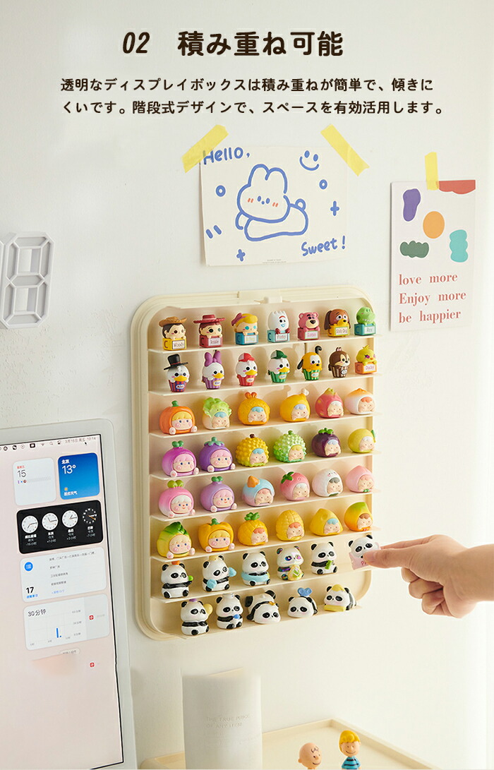 透明なディスプレイボックスは積み重ねが簡単で、傾きにくいです。階段式デザインで、スペースを有効活用します。
