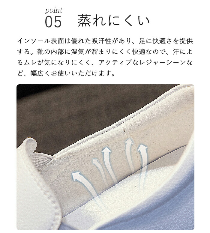 インソール表面は優れた吸汗性があり、足に快適さを提供する。靴の内部に湿気が溜まりにくく快適なので、汗によるムレが気になりにくく、アクティブなレジャーシーンなど、幅広くお使いいただけます。