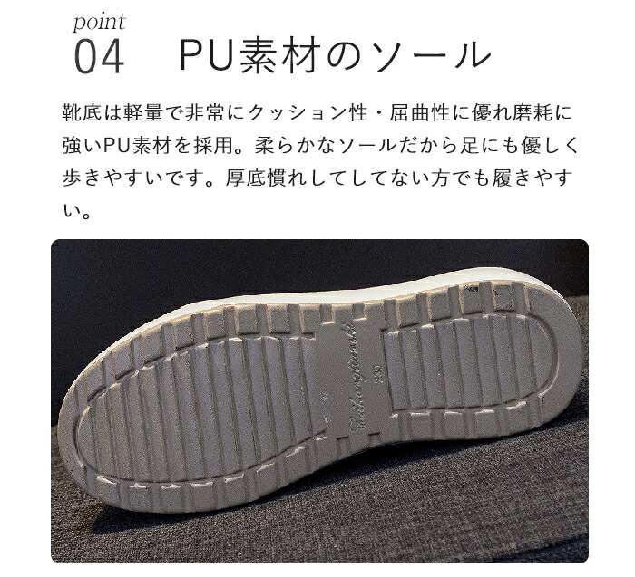 靴底は軽量で非常にクッション性・屈曲性に優れ磨耗に強いPU素材を採用。柔らかなソールだから足にも優しく歩きやすいです。厚底慣れしてしてない方でも履きやすい。