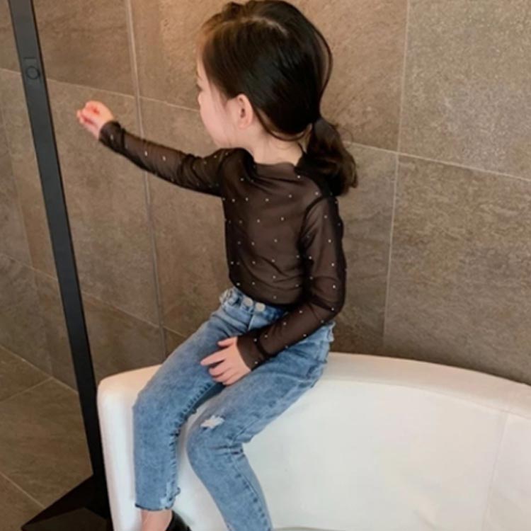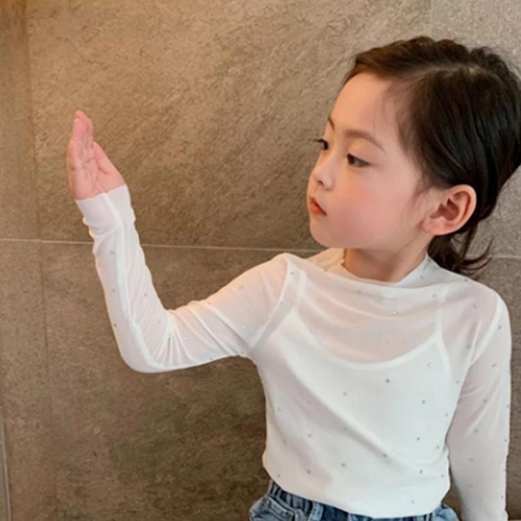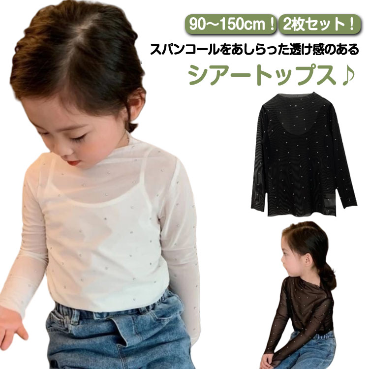 2枚セット シアー トップス キッズ 女の子 スパンコール 長袖 tシャツ UV 紫外線対策 春夏 レイヤード インナー ハーフネック 薄手 シースルー きらきら 透け感 ロンT 重ね着 無地