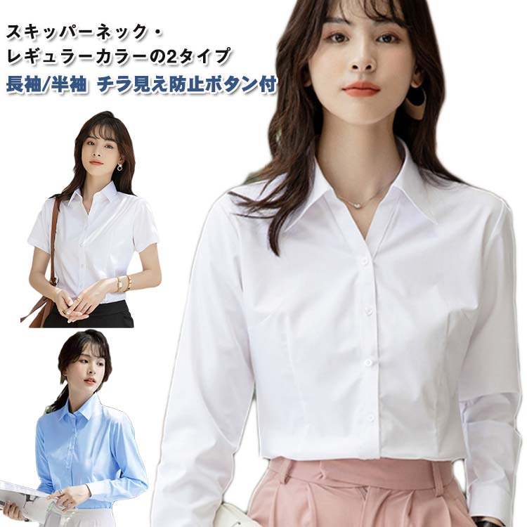 ワイシャツ レディース ブラウス 2タイプ レギュラー スキッパー チラ見え防止ボタン付 長袖 半袖 白シャツ 就活 オフィス シャツ 白 ブルー カッターシャツ 事務服 おしゃれ オフィスカジ 制服