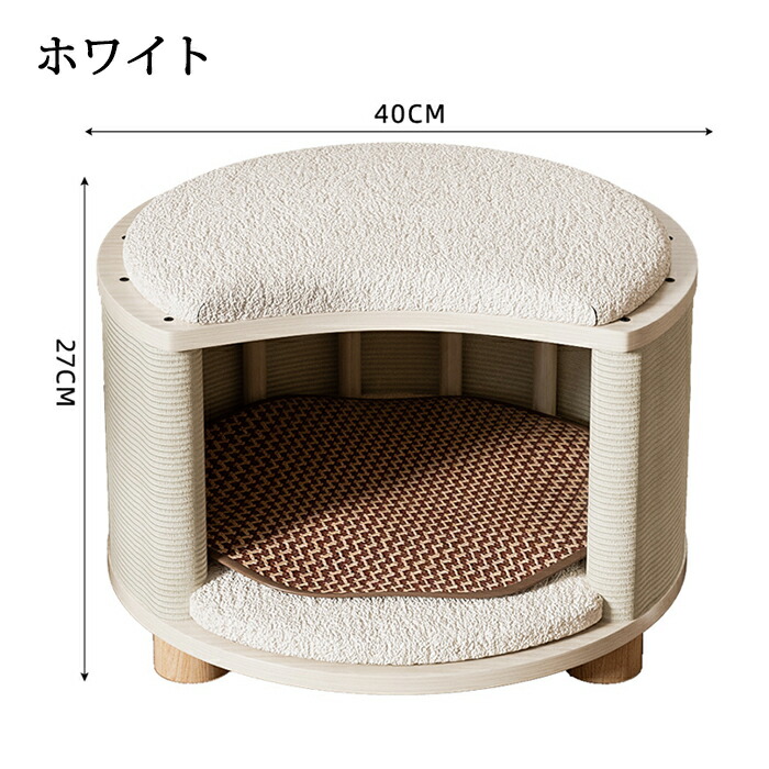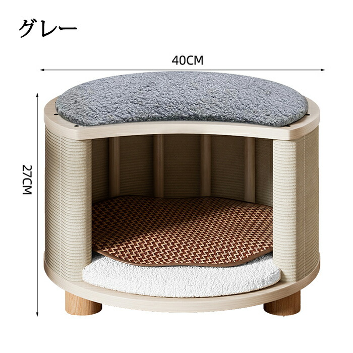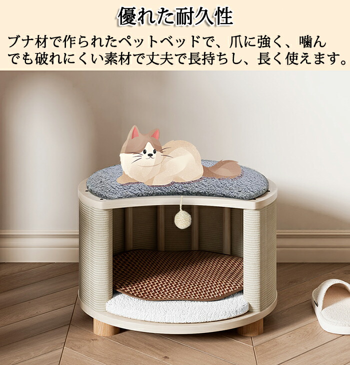 ブナ材で作られた猫用ベッドで、爪に強く、噛んでも破れにくい素材で丈夫で長持ちし、長く使えます
