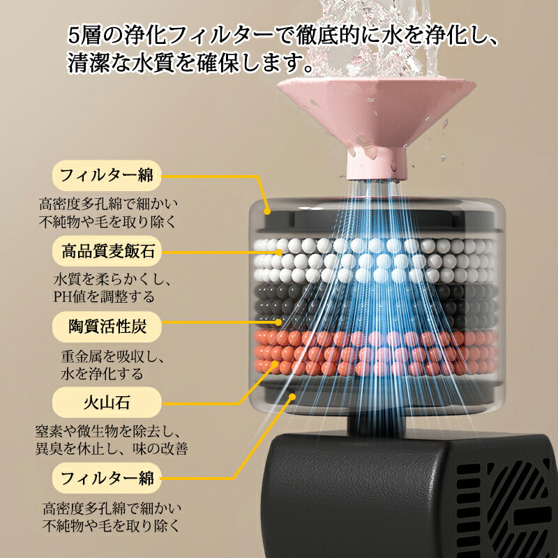 こちらの最新型循環式給水器では陶器を採用しており、無毒で無臭で環境にやさしい、ペットにも負担なし。衛生的でペットちゃんの健康を保ちます。自動給水器中に活性炭フィルターが付き、通り水中の埃、毛、食物残渣などを消去し、循環の水中に菌の増殖を防ぎ、循環的に新鮮な甘い流れ水を提供して、ペットがいつでも新鮮な水を飲めます。