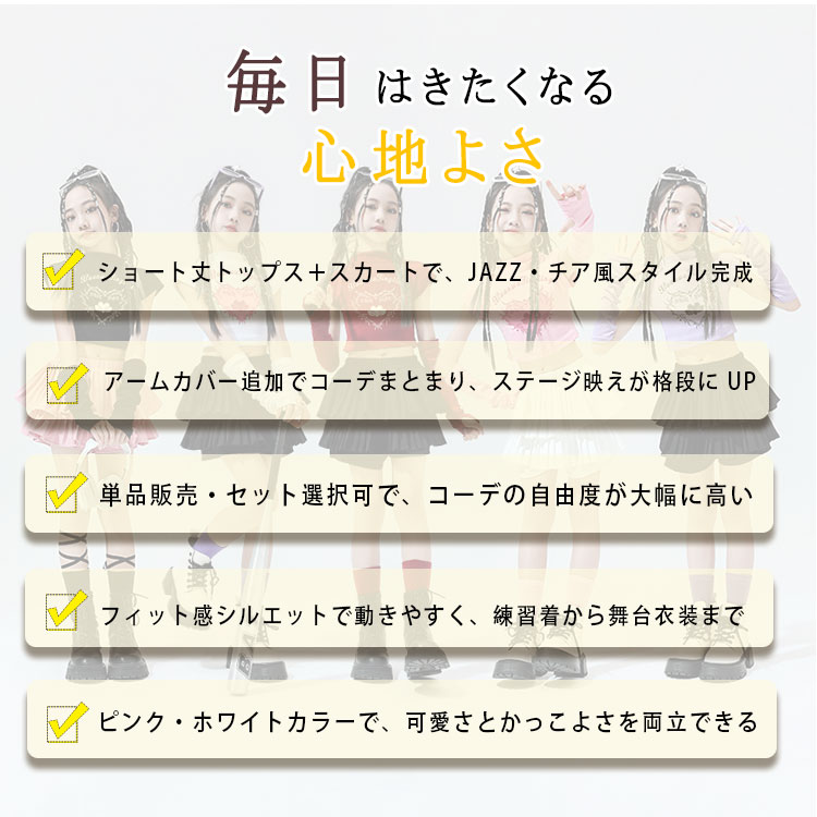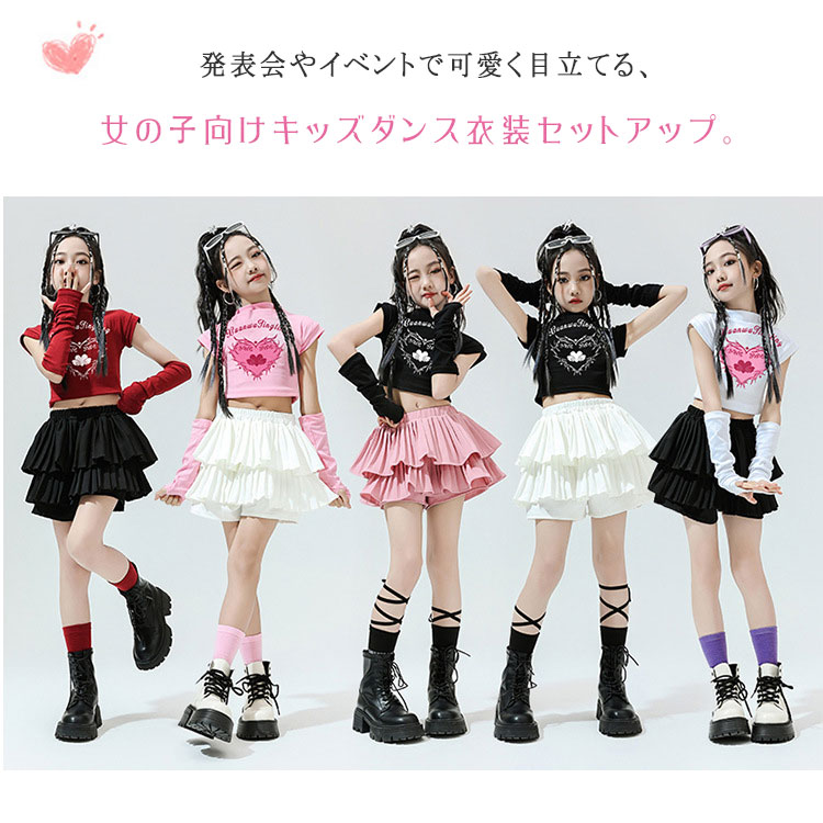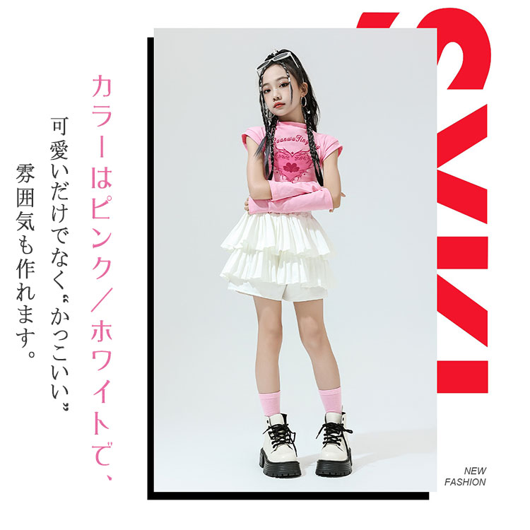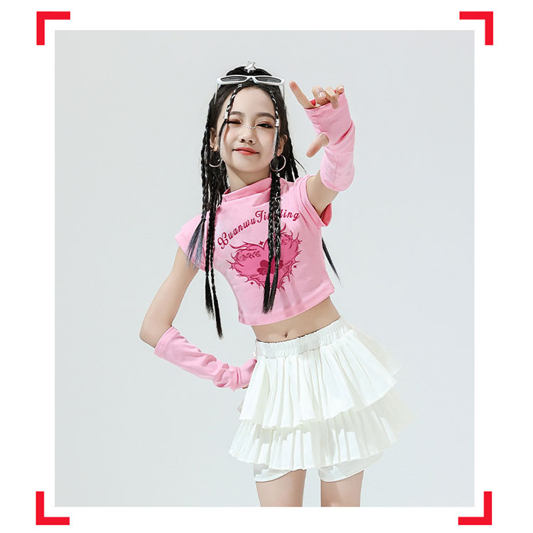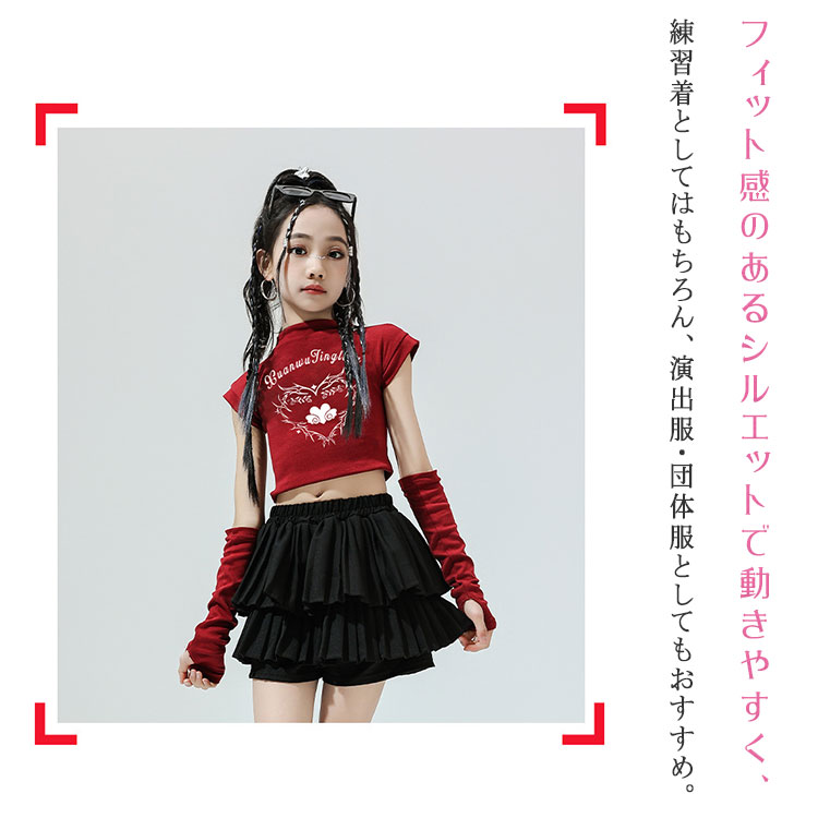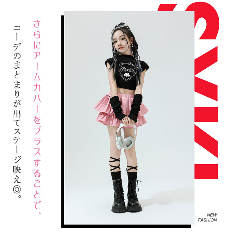 キッズ ダンス衣装 セットアップ 女の子 JAZZ チア チアガール K-POP 韓国風 ヒップホップ ショート丈 Tシャツ へそ出し トップス ダンススカート アームカバー付き 単品販売 スカート