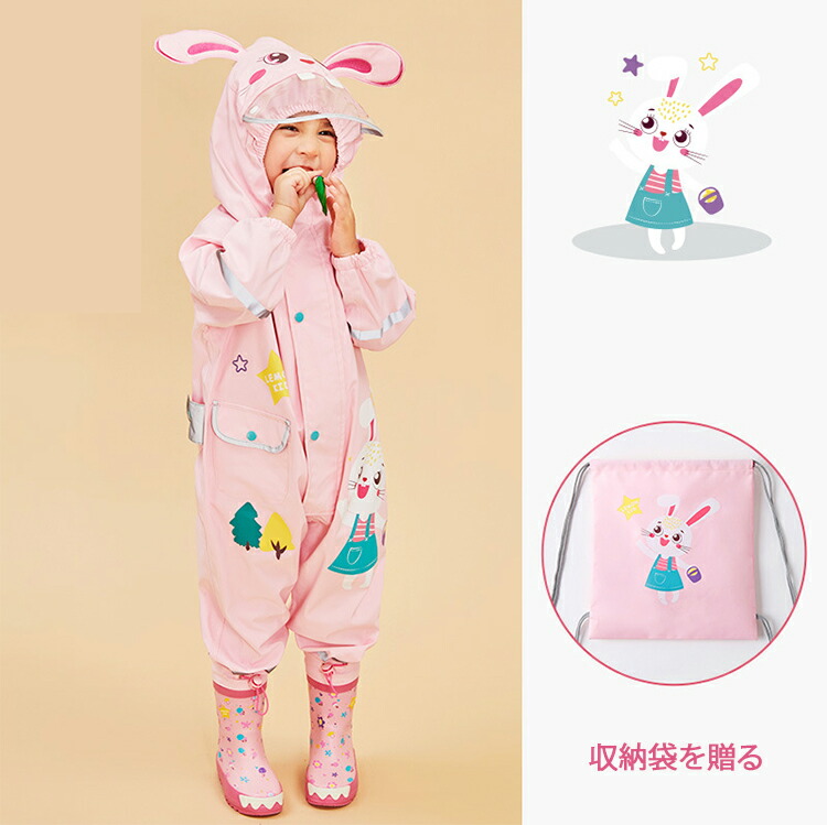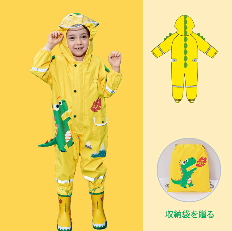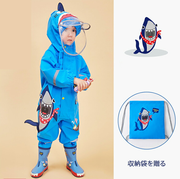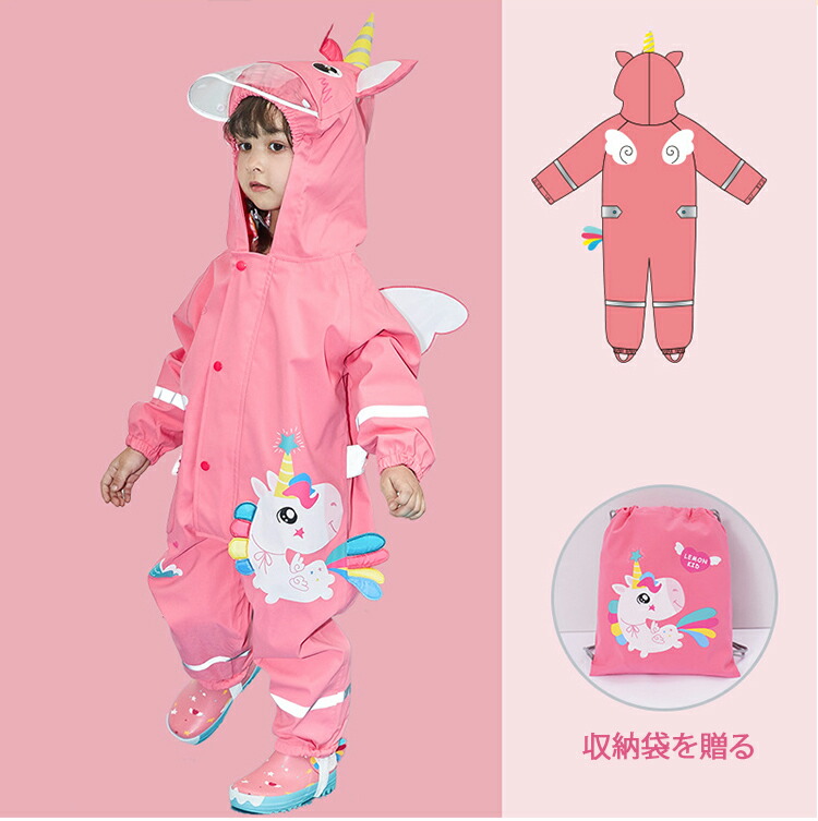 レインコート キッズ オールインワンレインコート フード付き 長袖 長ズボン 子供用 男の子 女の子 全4種 恐竜 ユニコーン うさぎ シャーク S M L XL 幼稚園 小学校低学年 キッズレインコート防水 収納袋付き