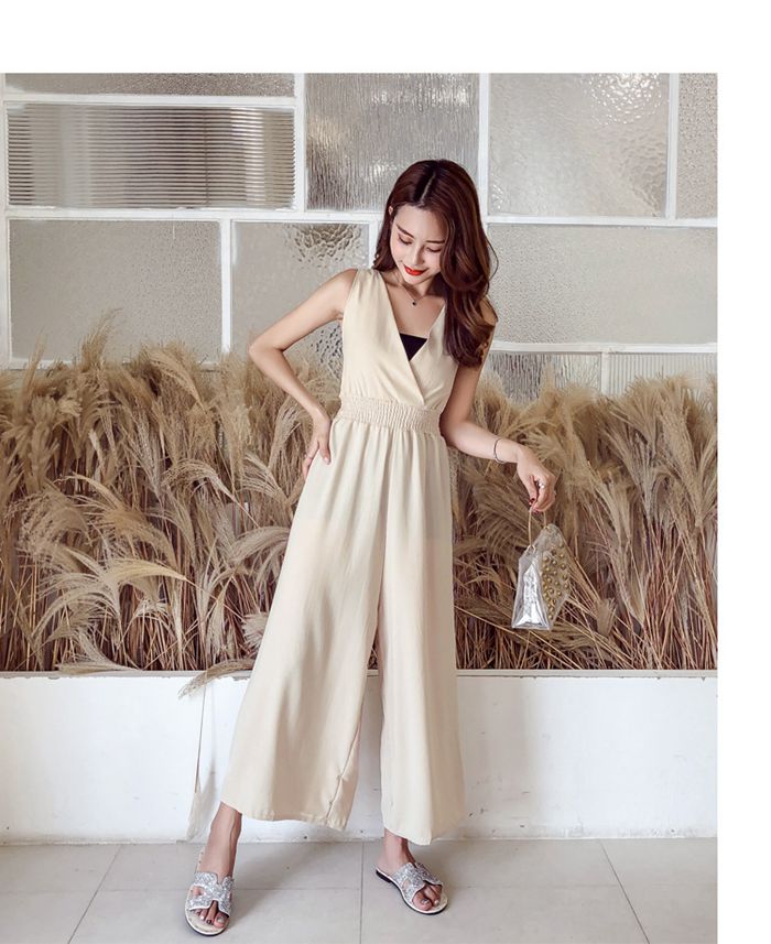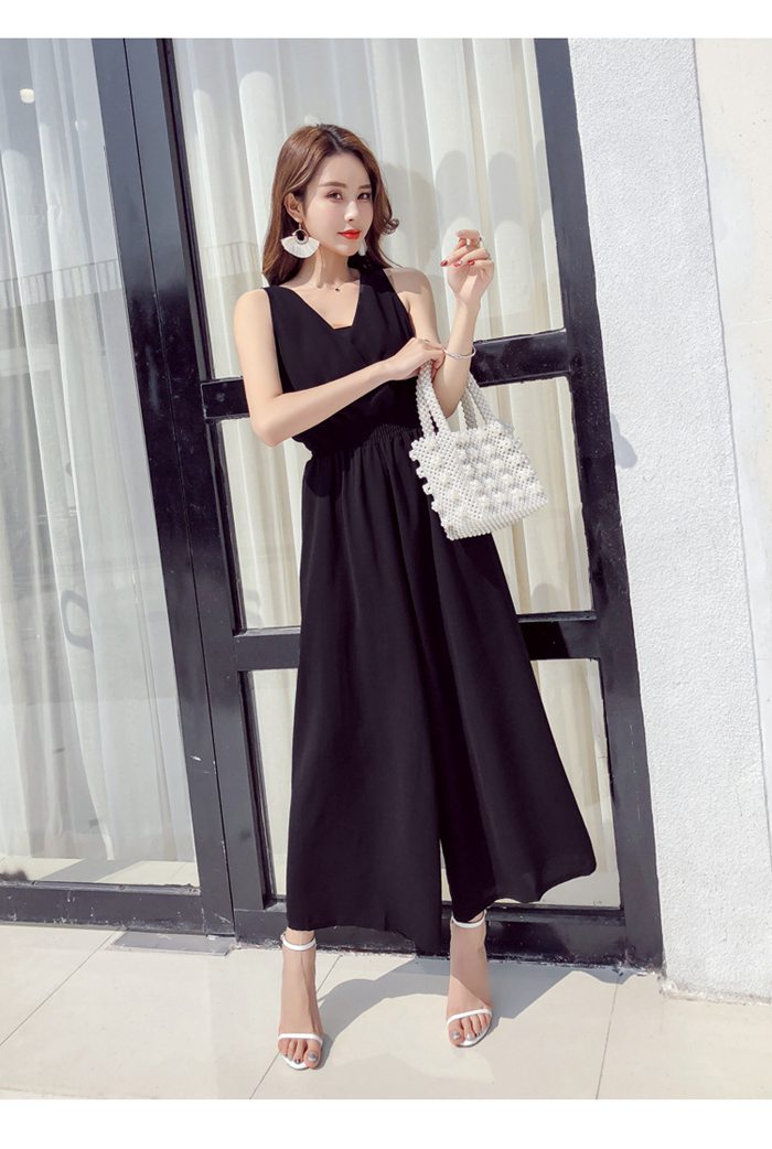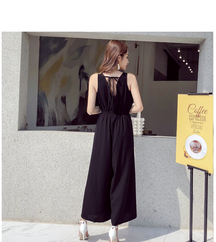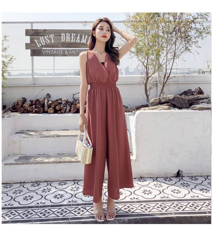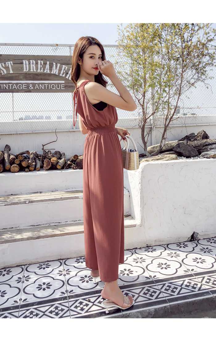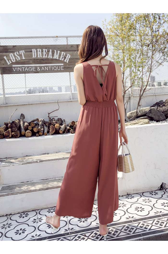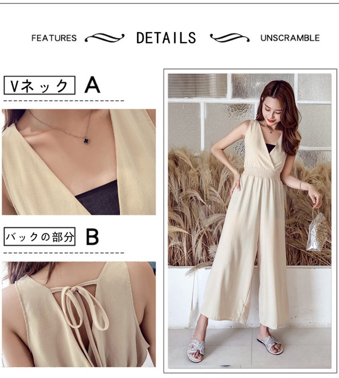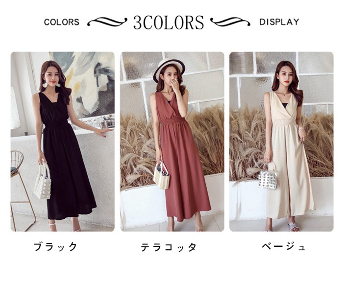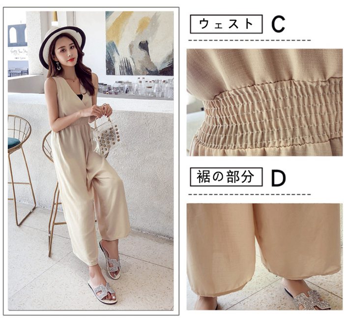 レディース 夏 サロペット パンツ 麻混 ノースリーブ 無袖 Vネック ハイウエスト ゴム仕様 ワイドパンツ ゆったり 着痩せ 無地 テラコッタ ブラック カーキ サックスフリーサイズ チー ベージュ
