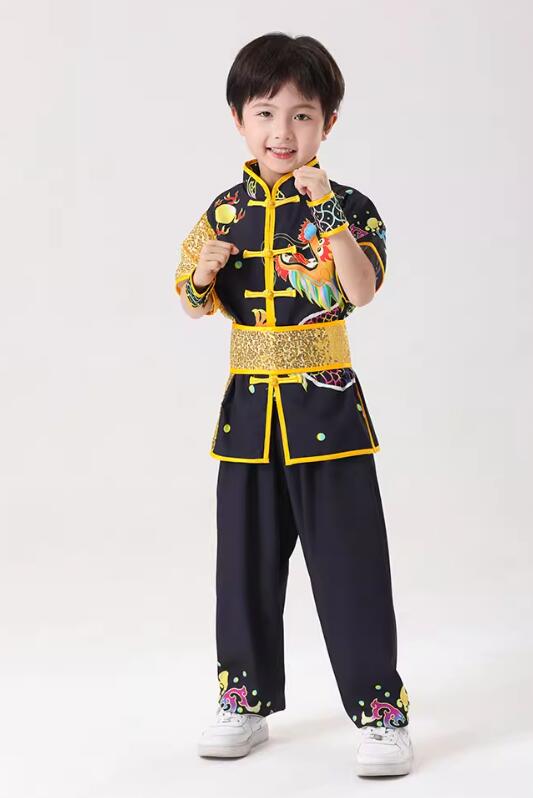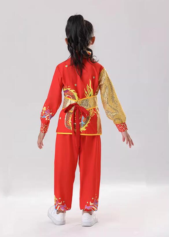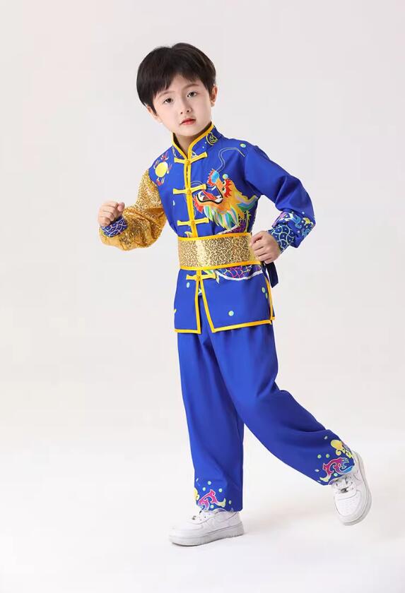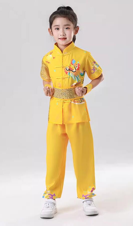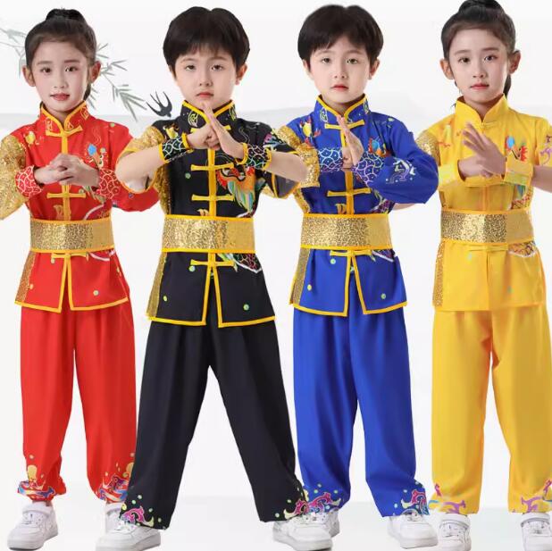 子供 太極拳服 上下セットアップ 110cm~180cm キッズ 男女兼用 女の子男の子太極拳ウエア 長袖 半袖 選べる 龍 プリント スパンコール ベルト付き 中華風 武術 気功 ウ カンフー