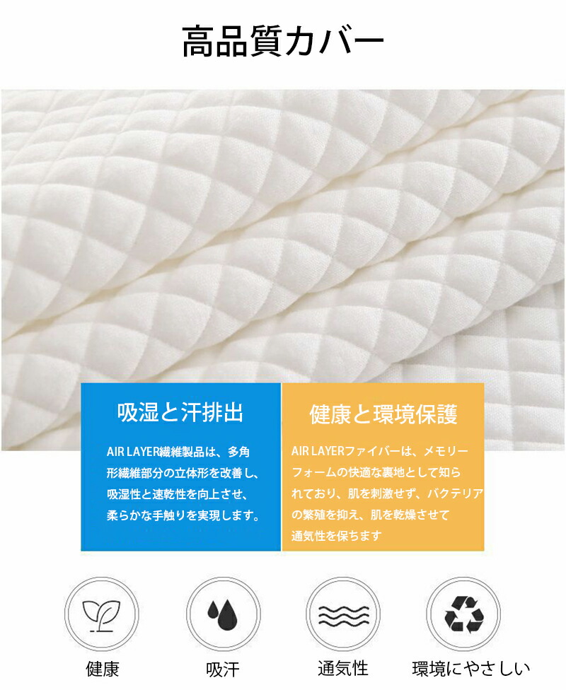 特別な空気層の生地を使用し、湿度と汗を排出し、細菌の増殖を効果的に防ぎます。高品質な繊維は湿気と抗菌性に優れ、長時間使用しても快適です。吸湿性に優れているため、夏でも快適に使用できます。汚れても心配ありません、家庭用洗濯機で洗える枕カバーなので、簡単に洗濯できます。