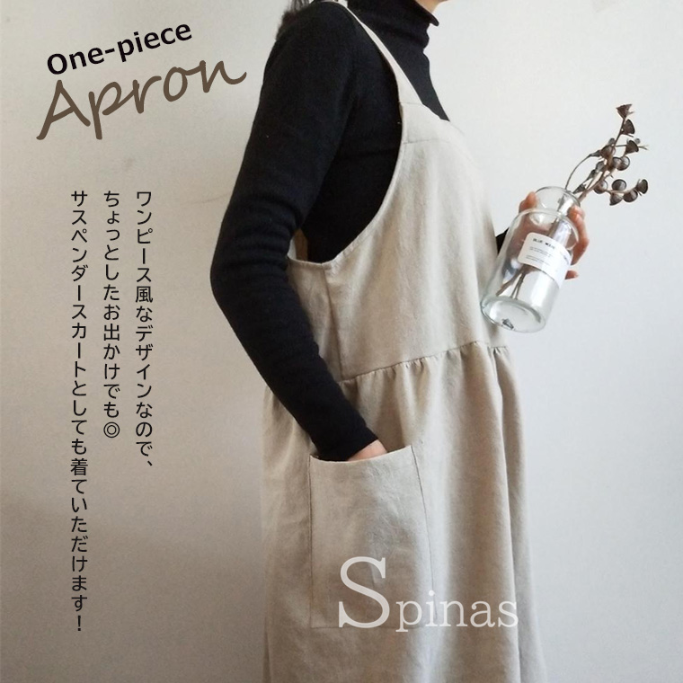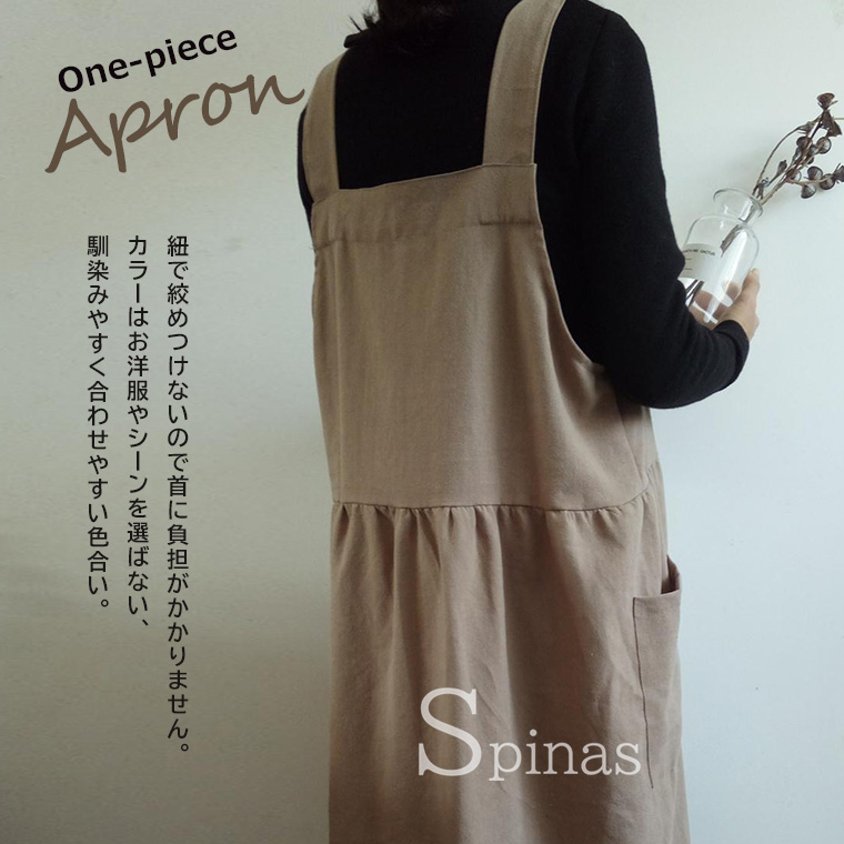 エプロン ワンピース 106cm丈 ナチュラル 北欧風 シンプル おしゃれ レディース 可愛い ポケット ギャザー切り替え 無地 お料理教室 ガーデニング ゆったりシルエット 全2色 カフェ