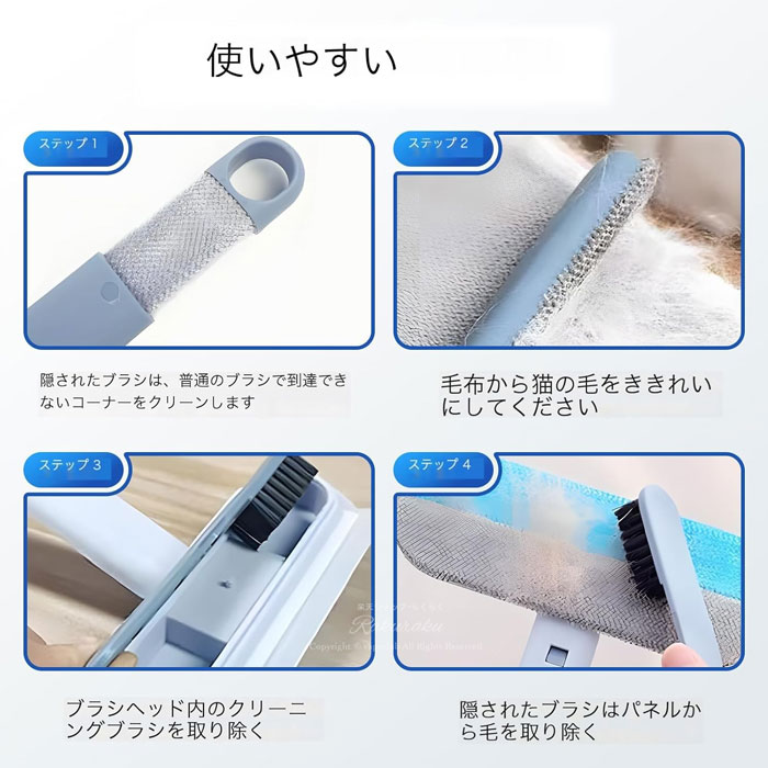 ・4 in 1 猫と犬の毛取りツール:複数のヘッドを備えたこのペット用毛取りツールは、ペットの毛を処理し、窓の水垢を取り除き、ひび割れや狭い隙間にも届きます。背面のシリコンストリップはミニスクイジーとしても使えるので、毎日のお掃除に幅広く活用できます。