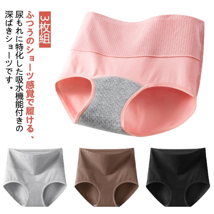 ふつうのショーツ感覚で履ける、尿もれに特化した吸水機能付きの深ばきショーツです。【3枚組】