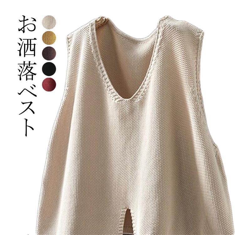 ニット ベスト 春 夏 レディース ジレ レイヤード トップス セーター スリット 重ね着 Vネック お尻が隠れる サマーニット 薄手 大きいサイズ 体型カバー ゆったり 黒 ブラック オフ シンプル