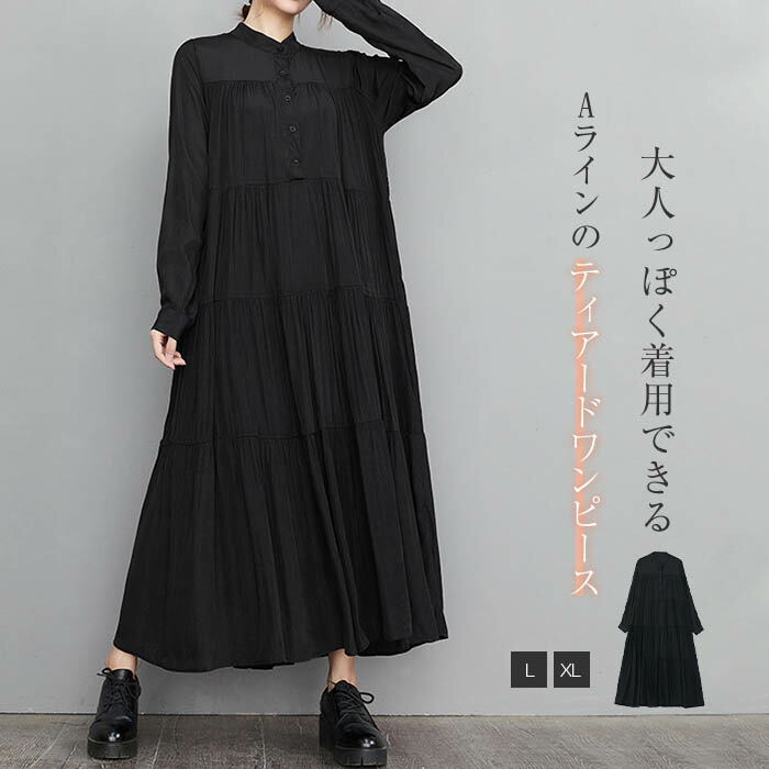 シャツ ワンピース レディース 秋 冬 春 ロングワンピース ティアードワンピース フレアワンピース 長袖 バンドカラー ティアード フレア aライン マキシ 大きいサイズ 無地 ロング