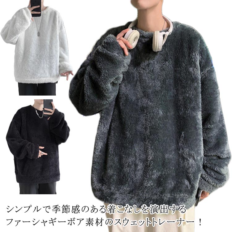 ビッグシルエット ボア ワイドシルエット トレーナー メンズ スウェット ファー トップス モコモコ シャギー ロゴ 無地 長袖 ドロップショルダー カットソー おしゃれ 秋 冬 人気