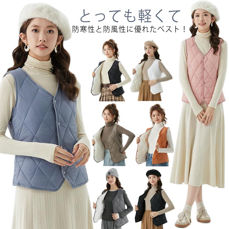 軽量 ダウンベスト レディース インナー アウター Vネック ダウン ベスト インナーダウン ライトダウン ウルトラライト 暖かい 防寒 防風 無地 細身 ダウン風 中綿 ジ エコダウンベスト