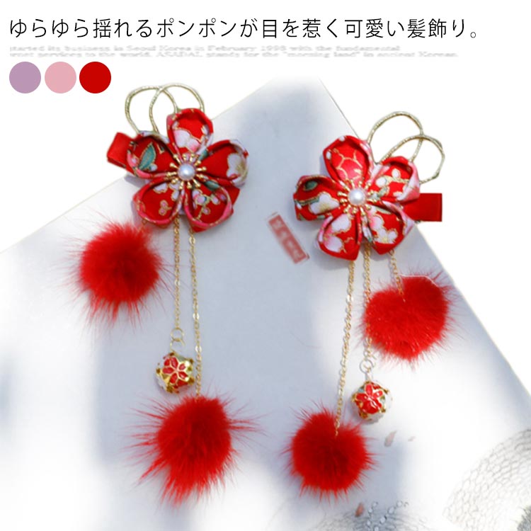 2点セット 七五三 髪飾り 夏祭り 浴衣 着物 ヘアアクセリー ヘアクリップ フラワー 和柄 ポンポン 揺れる 髪留め ヘアピン 花火大会 成人式 子供 大人 コスプレ 卒業式