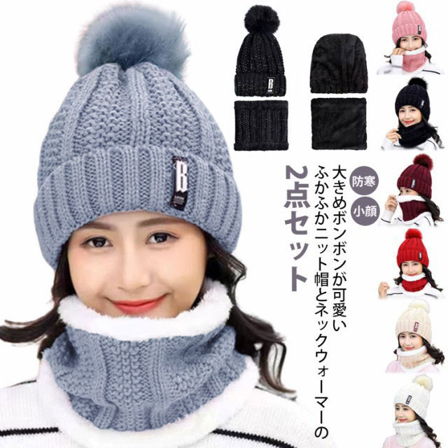 ニット帽 ネックウォーマー 帽子 厚手 ニットキャップ ボンボン付き ボア付き ワッチキャップ ビーニー レディースキャップ 大きいぼんぼん 秋 冬