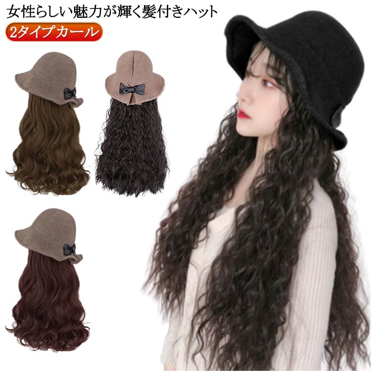 2タイプカール ウィッグ 付き 帽子 レディース 髪付き帽子 ウィッグ付き ロング 帽子付きウィッグ バケットハット ウェーブ 巻き髪 ロング巻き アクティブ 可愛 帽子ウィッグ