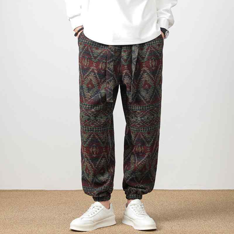 パンツ メンズ 秋冬 エスニック柄 ジャガード織り ニット ウール調 ヴィンテージ風風 くすみカラー スタイリッシュ ジョガーパンツ 切り替え 大きいサイズ カジュアル ミドルライズ 竹繊維 普段使い