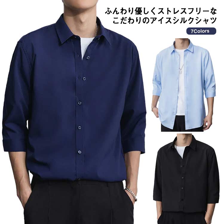 メンズ アイスシルクシャツ 7分袖 七分袖 七分袖シャツ 夏 冷感 秋 カジュアルシャツ 涼しい きれいめ 春 メンズシャツ 夏シャツ 無地シャツ カジュアル M XL 2XL 3XL L